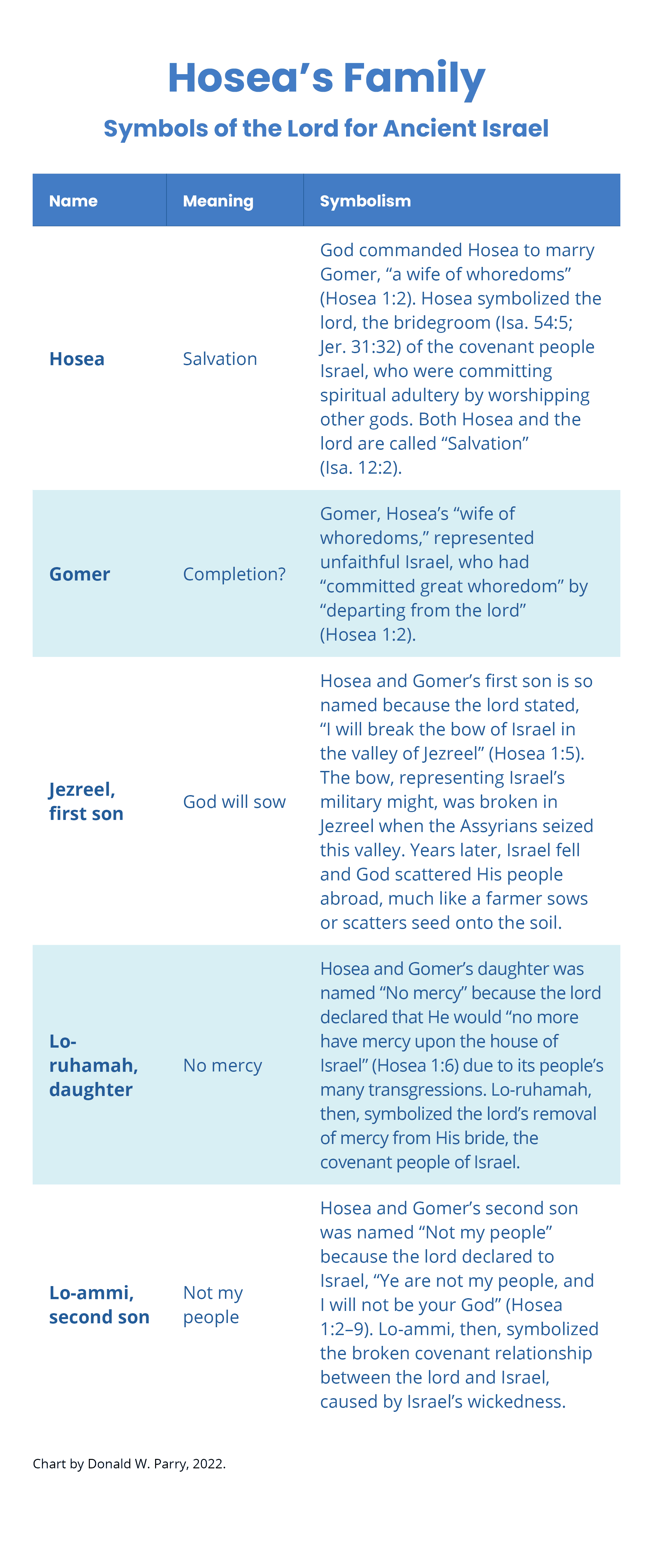 The chart sets forth the Hebrew names of each of the five family members (column 1), the English meaning of the names (column 2), and the symbolic value of each of the family members (column 3). Note how the lord, through Hosea, employed special wordplays with the three children’s names to teach us about His relationship with the house of Israel.