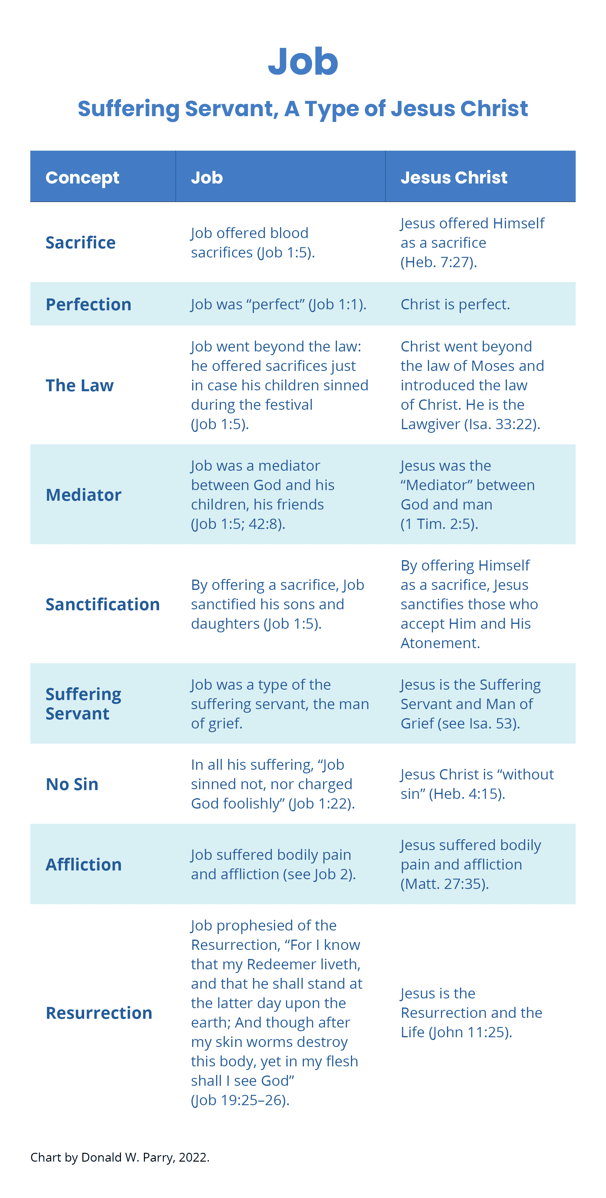 Job, a man from the land of Uz, is described as being “perfect and upright, and one that feared God, and eschewed evil” (Job 1:1). Job’s uprightness emulates Jesus Christ’s excellence, and Job’s blamelessness foreshadows Jesus’s sinlessness. Job offered sacrifices and sanctified his children (Job 1:1, 5), anticipating Jesus’s infinite sacrifice and the sanctification of those who will become his sons and daughters. Job served as a mediator between God and his children and friends (Job 1:5; 42:8), and Jesus was the “one mediator between God and men” (1 Tim. 2:5).