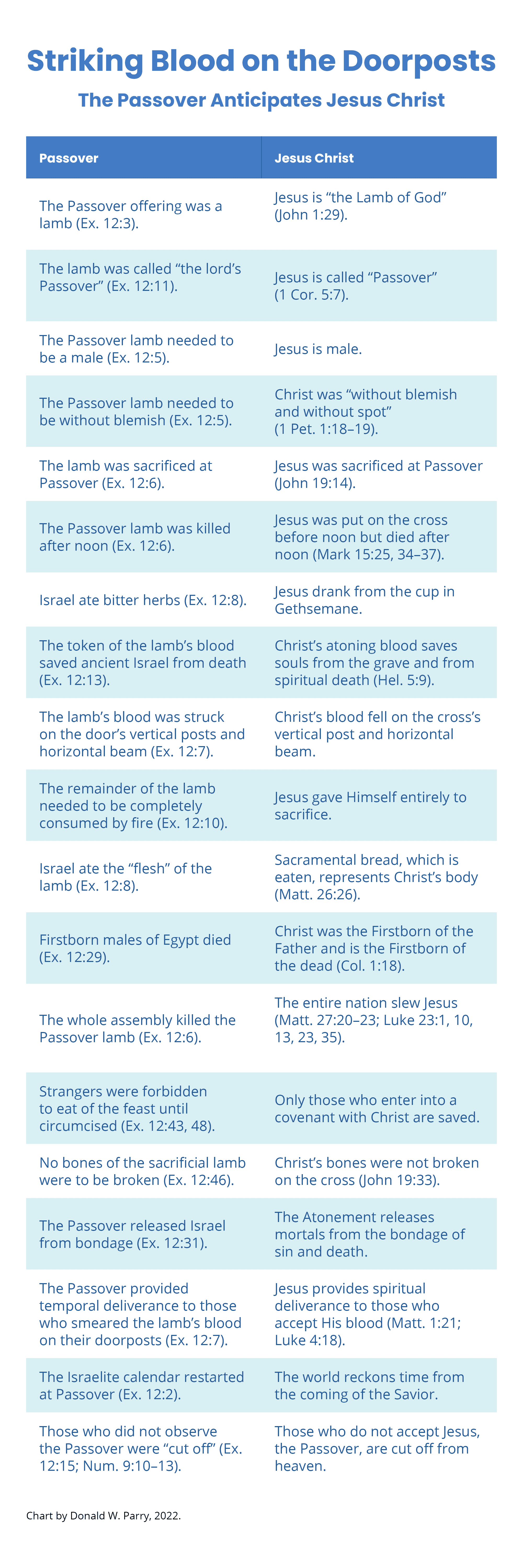 Enacted annually during the Jewish month of Abib (which occurs around March or April), the Passover recalls the occasion when God’s destroying angel “passed over” the obedient of Israel. This feast, as prescribed in Exodus 12, points to Jesus Christ’s atoning sacrifice. The sacrificed Passover lamb (Ex. 12:3–6, 46) prefigured Jesus Christ, who became the Lamb sacrificed for the sins of the world. The lamb was to be without blemish (Ex. 12:5), just as Jesus Christ would be without blemish (1 Pet. 1:18–19), and the Passover lamb had to be a male (Ex. 12:5), perhaps prefiguring Jesus’s gender.