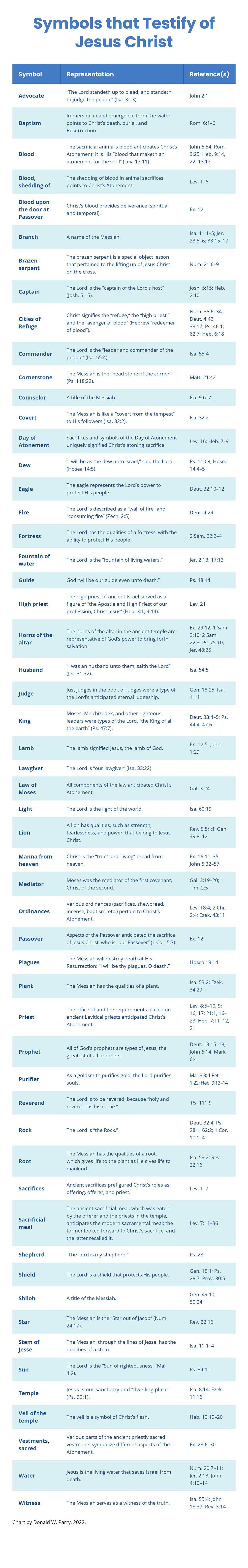 Jesus Christ is the focus of all scripture. In presenting truths about Jesus, the prophets used a number of symbols to provide insight into His life, mission, character, and Atonement. They drew on the natural world, things in the heavens, the temple and its structures, the cosmos, flora and fauna, the animal kingdom, civil and religious positions, building and architectural components, and many others. This chart presents a sampling of symbols that point to Jesus Christ.