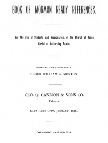 It has occurred to the compiler of the present volume that "Book of Mormon Ready References” might be equally valuable, both to missionaries and other Saints desirous of seeing at a glance the perfect harmony between the different sacred volumes— "the stick of Judah” and “the stick of Ephraim.” The result is found in these pages, which are now sent out into the world with an earnest desire that they may help to a better understanding and appreciation of the Book that came forth through the administration of angels, and the testimony of which has been sealed by the blood of martyrs.Subject Keywords