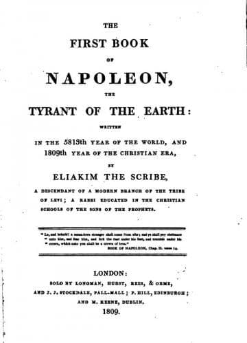 The First Book of Napoleon is a pseudo-biblical work written under the pen name "Eliakim the Scribe." As a contemporary reviewer noted, the language adopted would be effective in the minds of the common people, who would see in it the echo of their venerated scripture. The book provides "a just view of the principles which led to the French revoltion, to the elevation of [Napoleon] Buonaparte to the [French throne], and to all the miseries under which the continent of Europe has so long groaned" and contrast them with the happy state of the people of "Albion" and its King.