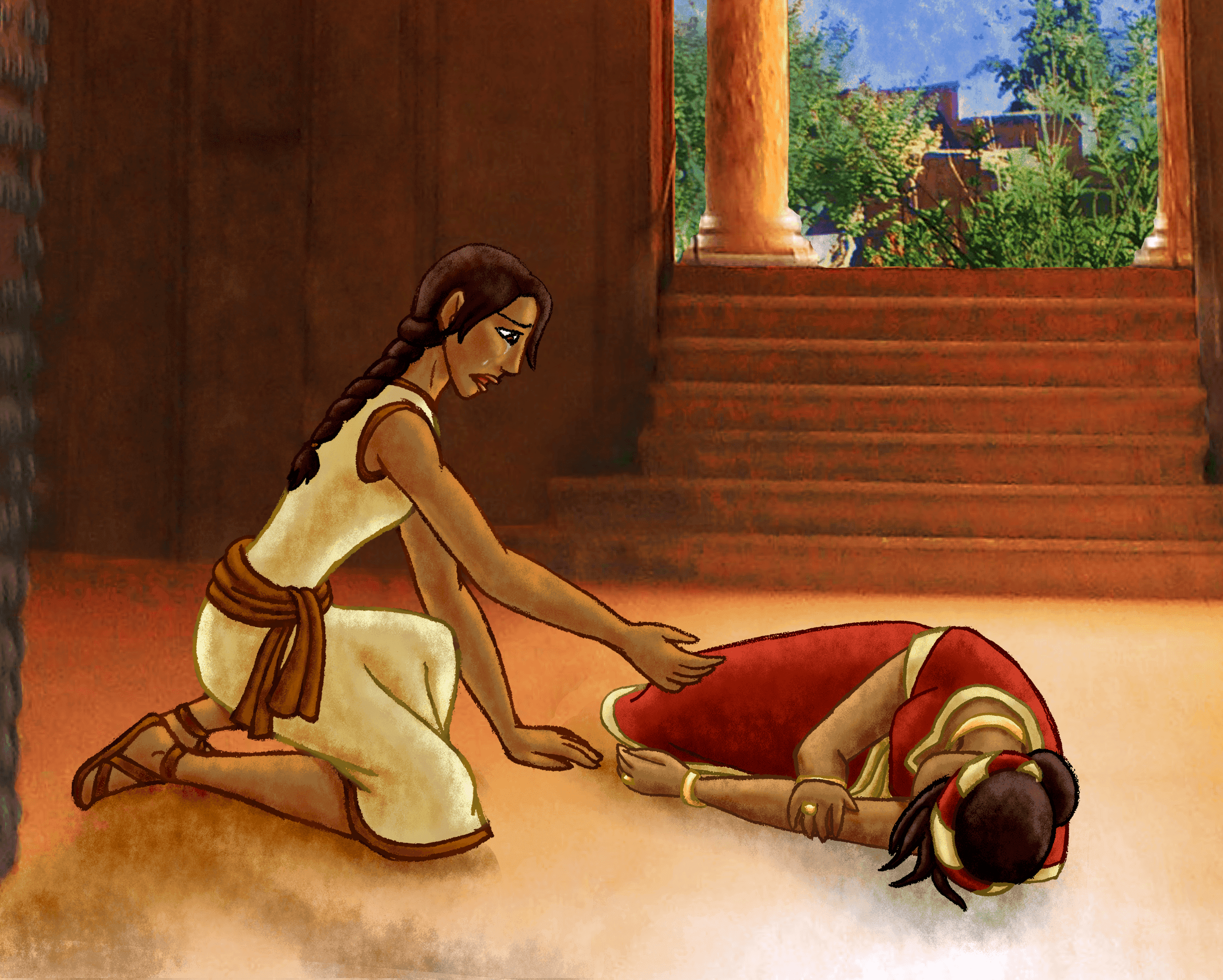An image of the scene in Alma where Abish reaches out to take the queen's hand.