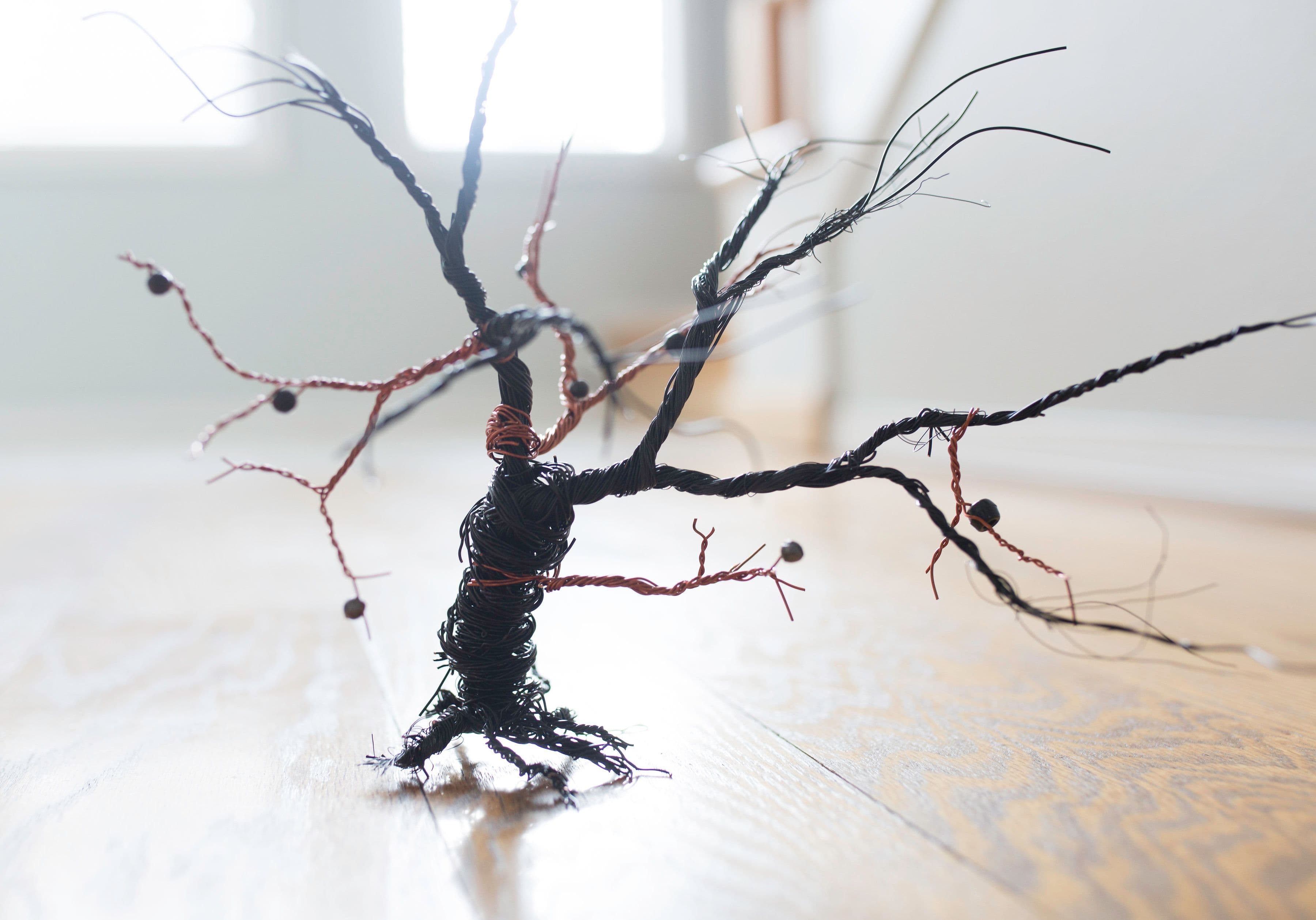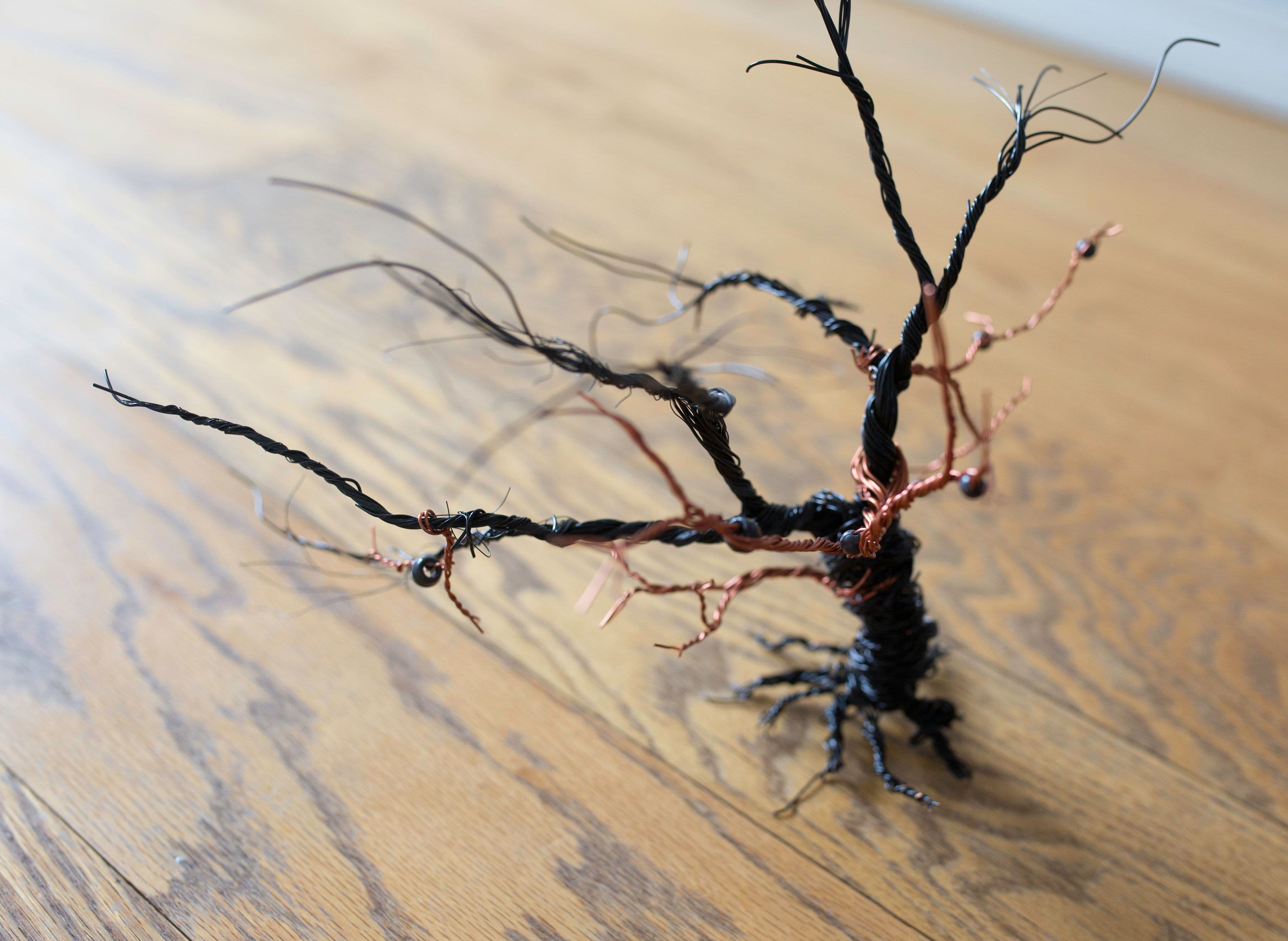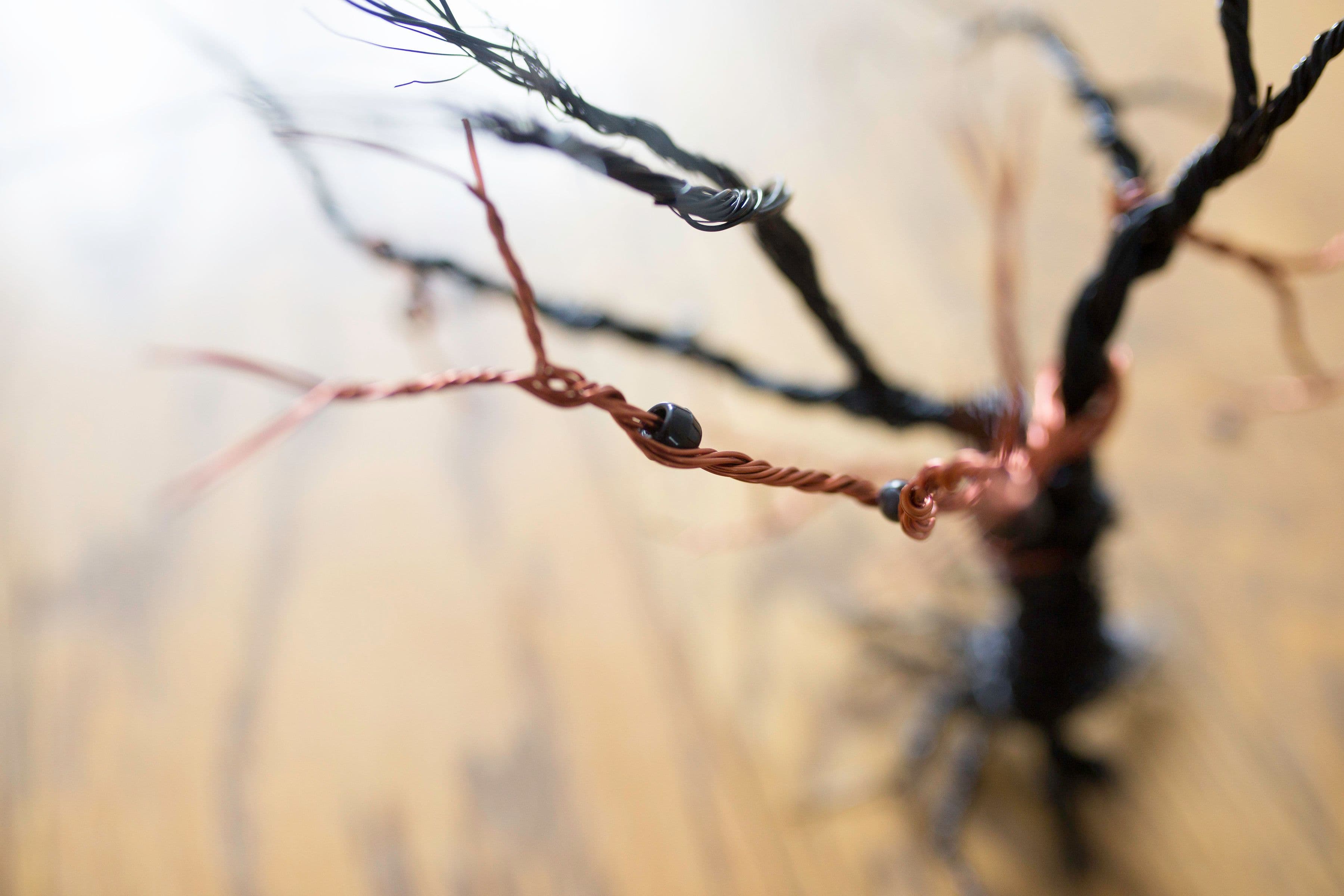 A wire sculpture of an olive tree. The gray trunk and branches represent the wild tree that will not bring forth good fruit but has a strong root. The copper branches are the branches that the Lord of the Vineyard grafted from the original trees.
