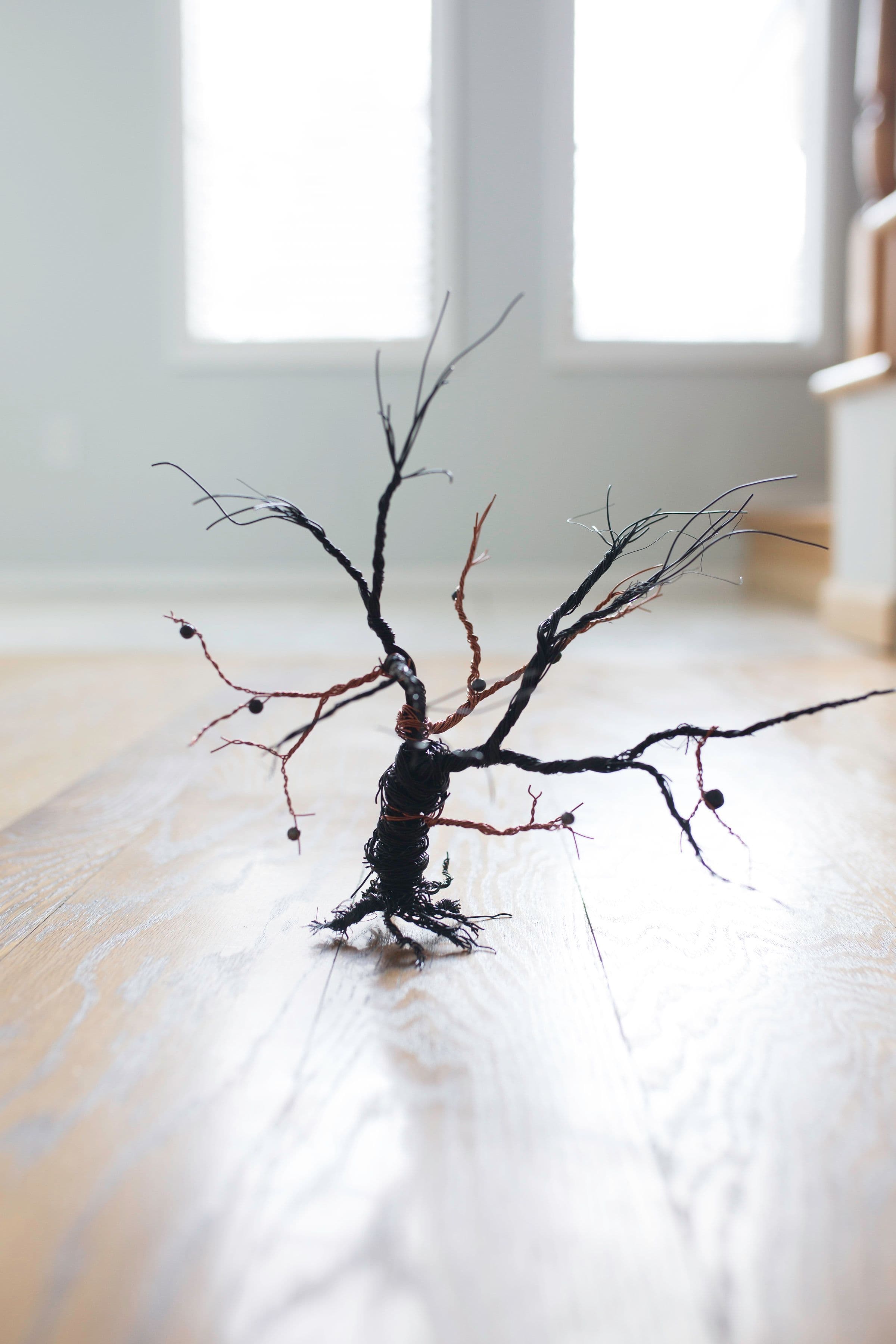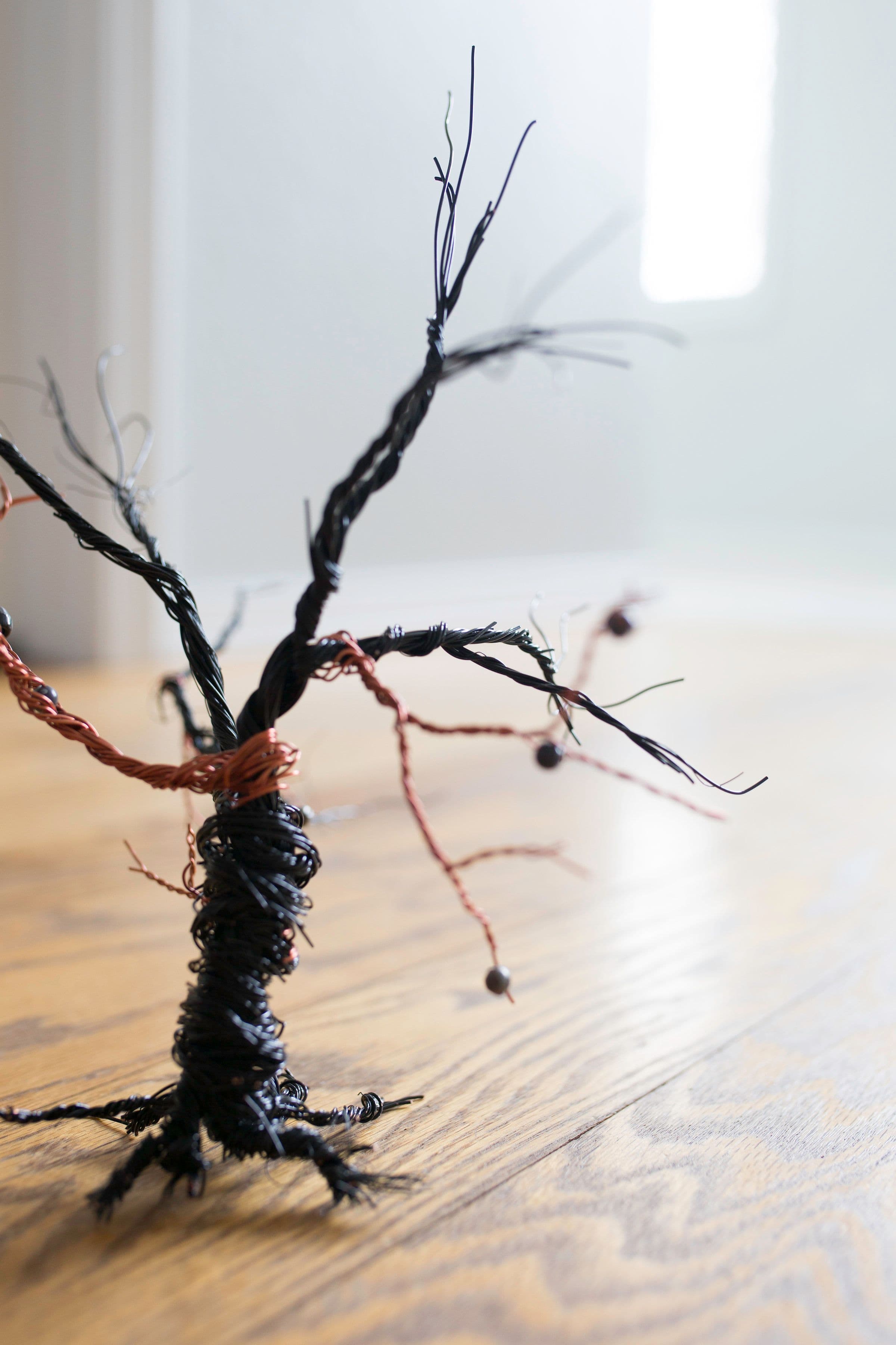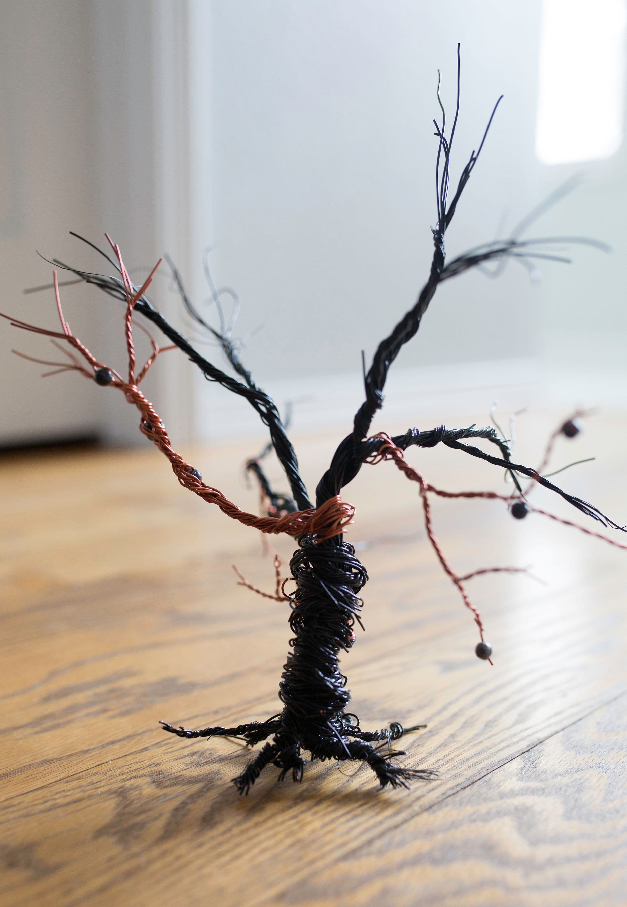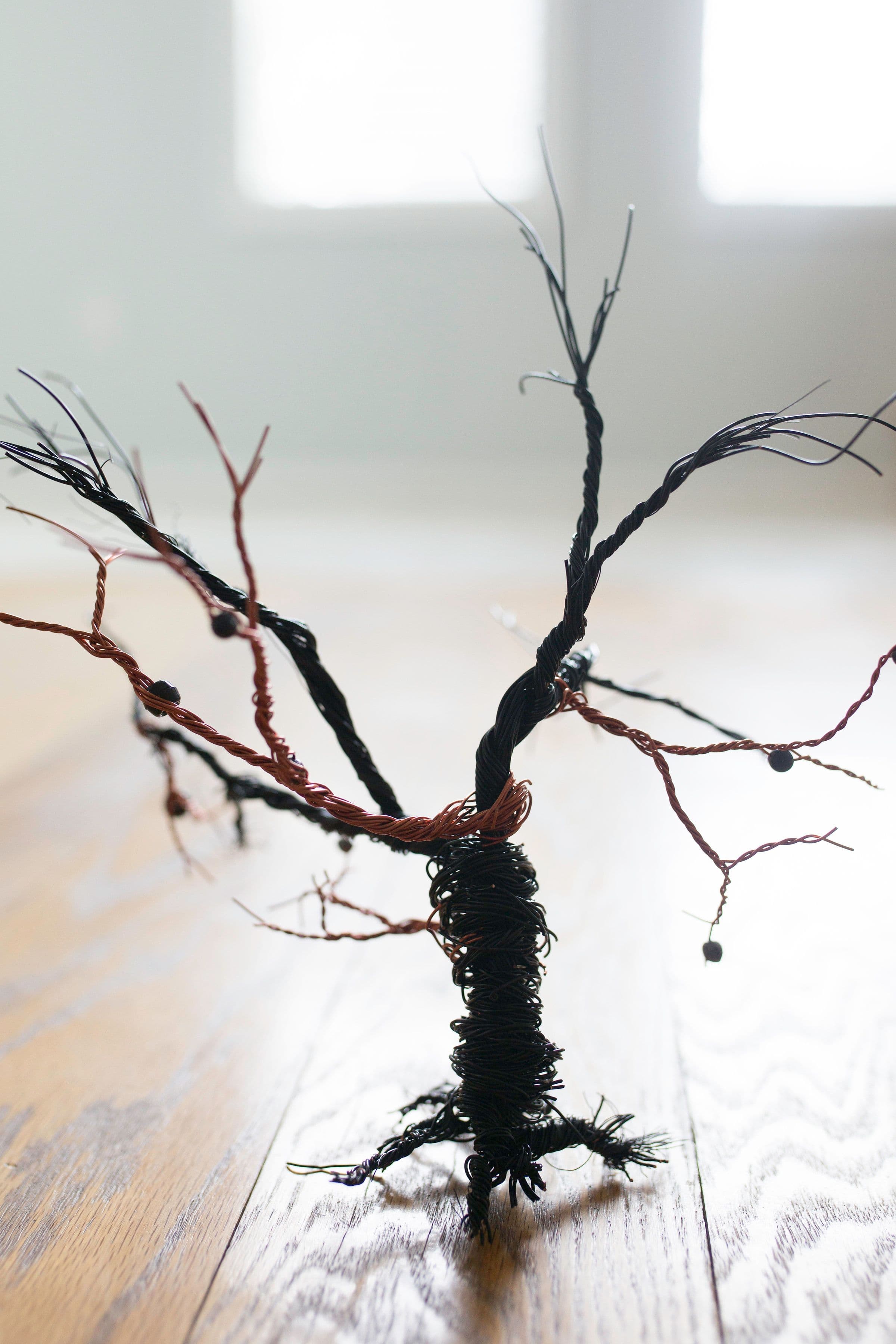 A wire sculpture of an olive tree. The gray trunk and branches represent the wild tree that will not bring forth good fruit but has a strong root. The copper branches are the branches that the Lord of the Vineyard grafted from the original trees.
