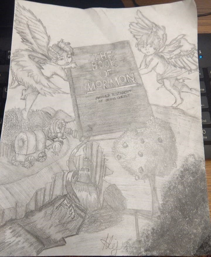 Two angels holding a Book of Mormon, Pioneer Wagons, the river between the Tree of Life and the wagons, in the right hand lower corner is the darkness and the Iron Rod.