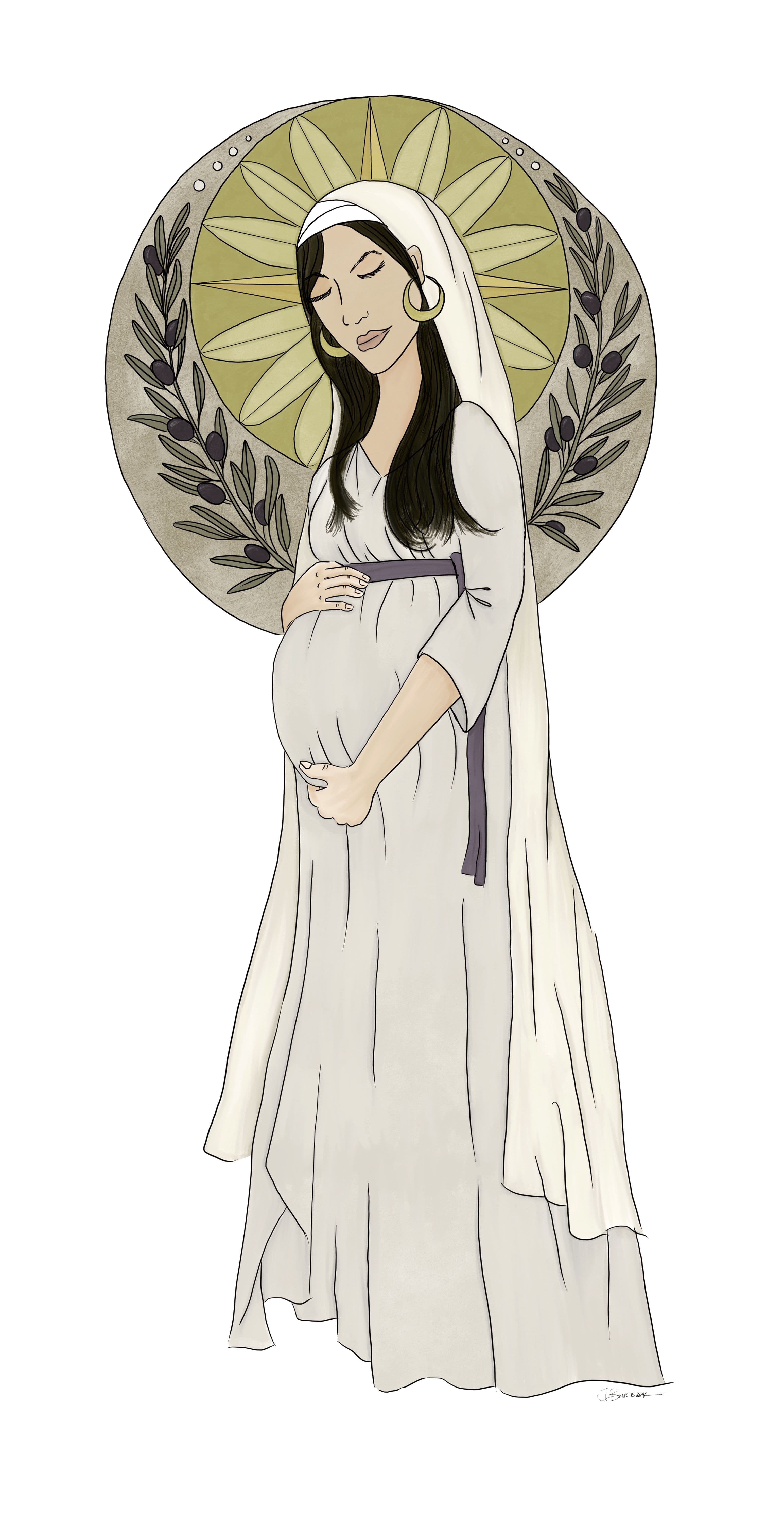 This piece was inspired by the artist's fascination with the women in the scriptures and portrays the wife of Nephi, whose name is unknown. In 1 Nephi 17:1-2, we learn that the women “bore children in the wilderness” and “were strong, yea, even like unto the men”. In the background, olive branches represent the “fruitful bough” that “run over the wall” spoken of by the patriarch Jacob, in a blessing to his son Joseph. The children born to this company in the Arabian wilderness, were the beginning of the fulfilment of this blessing. Compass points are also depicted, representing the liahona and the faithfulness of this woman, who journeyed into the unknown with her new husband and family, trusting in the Lord as they travelled. Her sash is coloured purple – a colour often associated with royalty, nobility and power. This represents her power and spiritual lineage as a daughter of God.