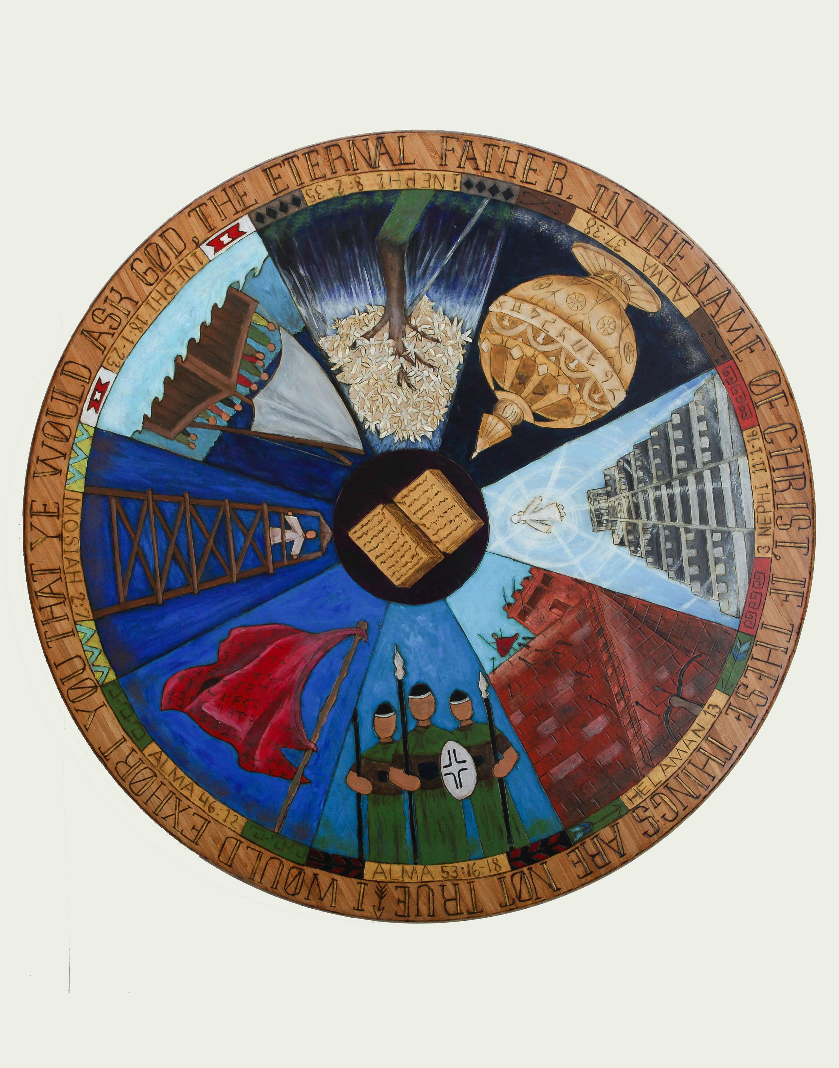 Honorable Mention in the 2017 Book of Mormon Central Art Contest The piece is a bamboo turntable 21' in diameter which has been designed, burned, and painted with acrylics depicting stories from the Book of Mormon, accompanied by the scriptures from which they come, and Moroni's promise written around the rim of the piece.