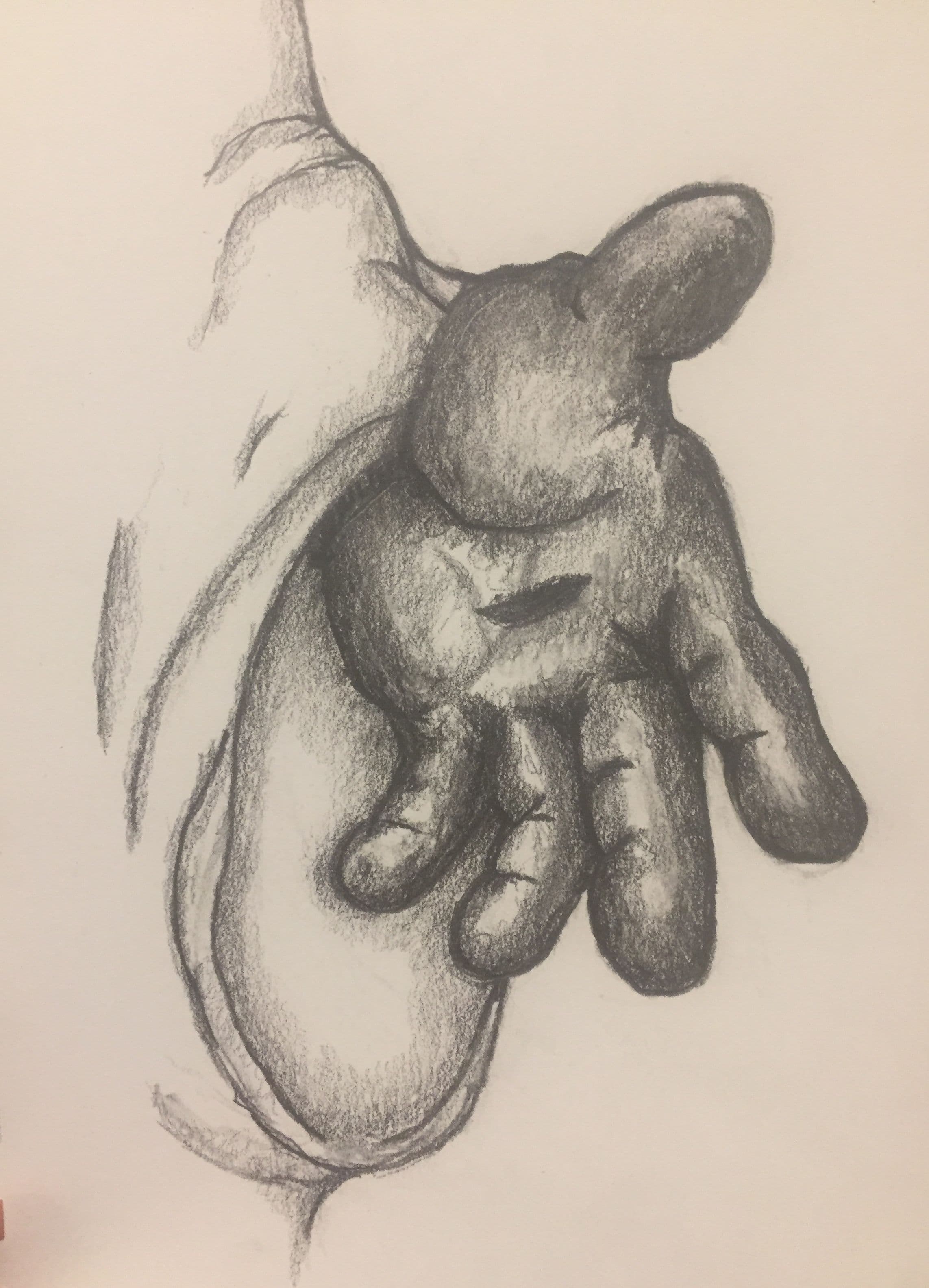 This piece comes from 3 Nephi 11:14. During these chapters Christ had come again to visit the Nephites, and testified unto them that He was the Savior of the world, Jesus Christ. Matthew Jepson felt inspired to draw his hand showing the "prints of the nails" to manifest his true identity. He extends his hands outward to us inviting us to come to know of Him ourselves. Hopefully we all can ""arise and come forth"" unto Him when his hands are outstretched to us one by one.