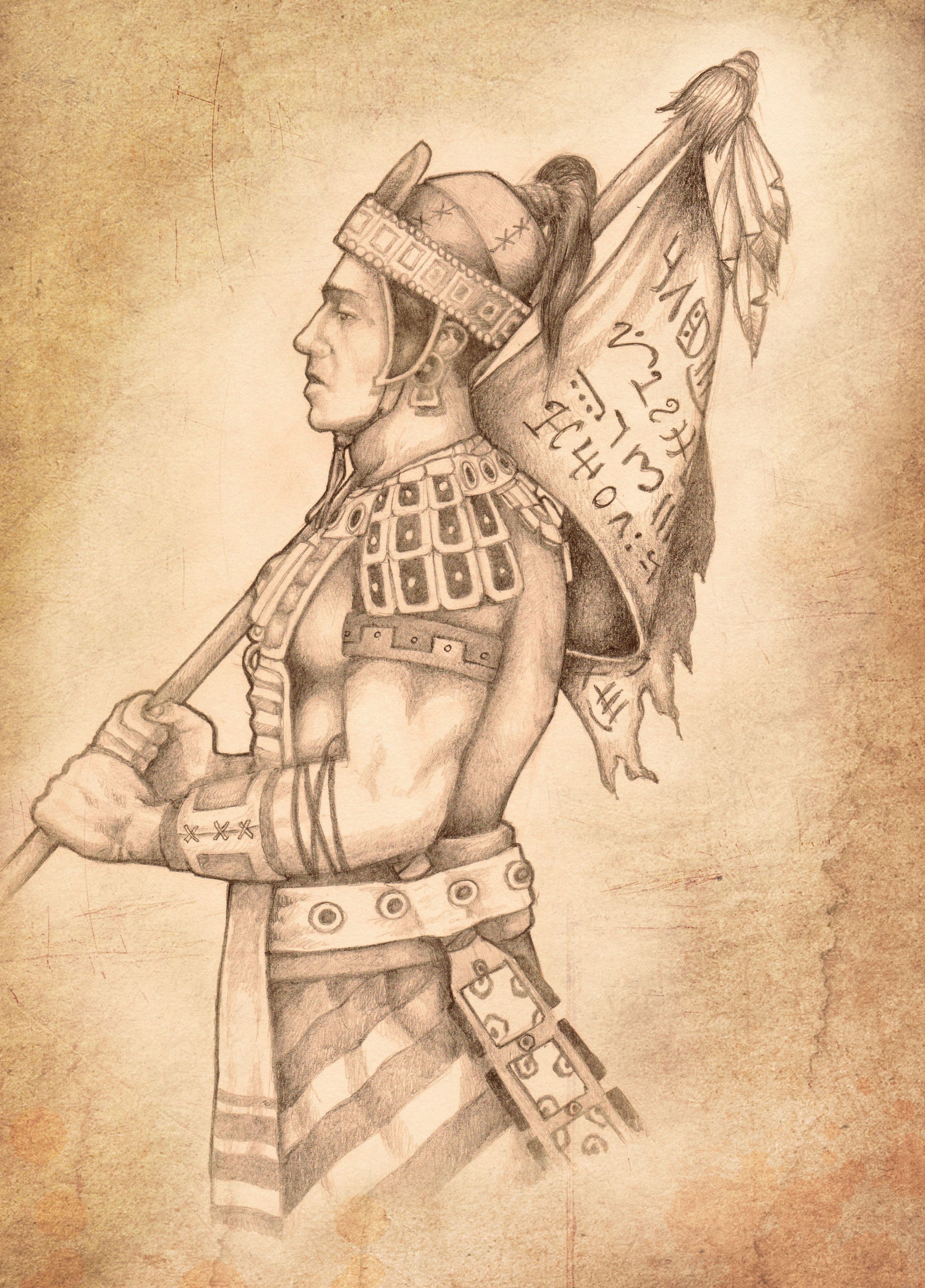 Captain Moroni is here portrayed by the artist holding a war banner. and dressed in Mesoamerican garb.