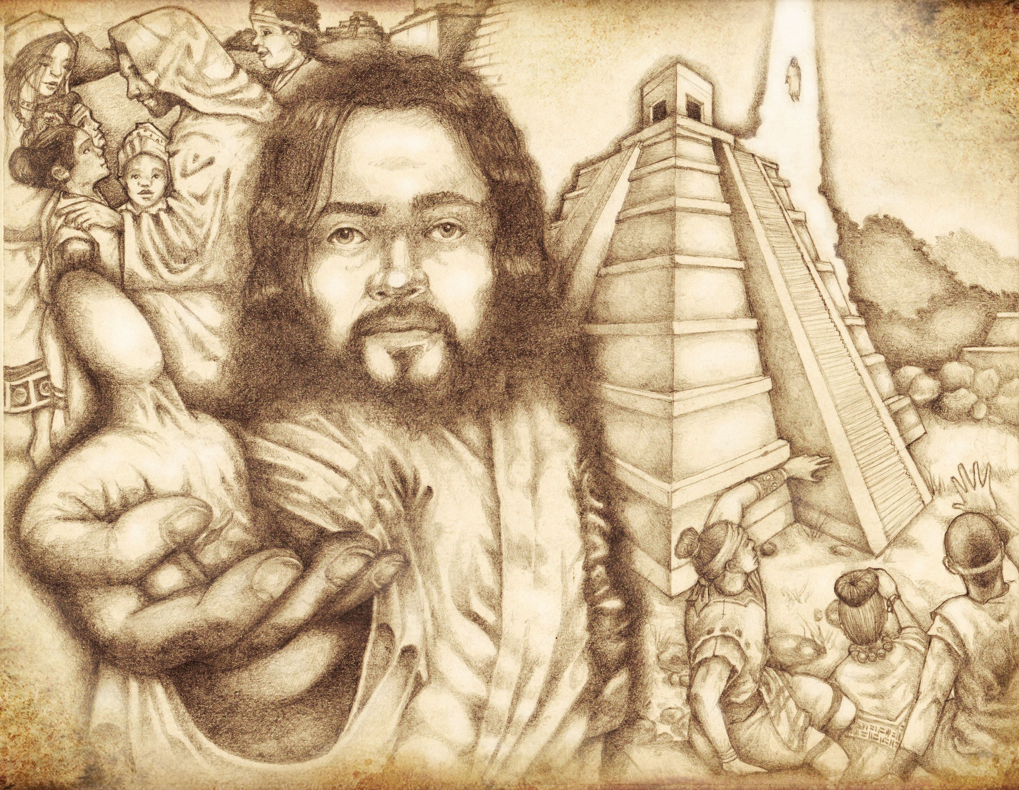 This piece is entitled, "Christ Among The Nephites". This piece of artwork shows two scenes depicted in the Book of Mormon during the ministry of Christ in the Americas. Particularly the ascension of Christ in 3 Nephi 11 at the temple in Bountiful and ministering to the children found in 3 Nephi 17. These two moments in the Book of Mormon show a side of Christ that may not be as prevalent in other scripture. Its a softer more tender side of Christ that shows a love for his children. These two moments are combined by a central image of Christ with his arm extended to the viewer as if inviting to come and partake of the goodness of the message contained in the Book of Mormon, "Another Testament of Christ".
