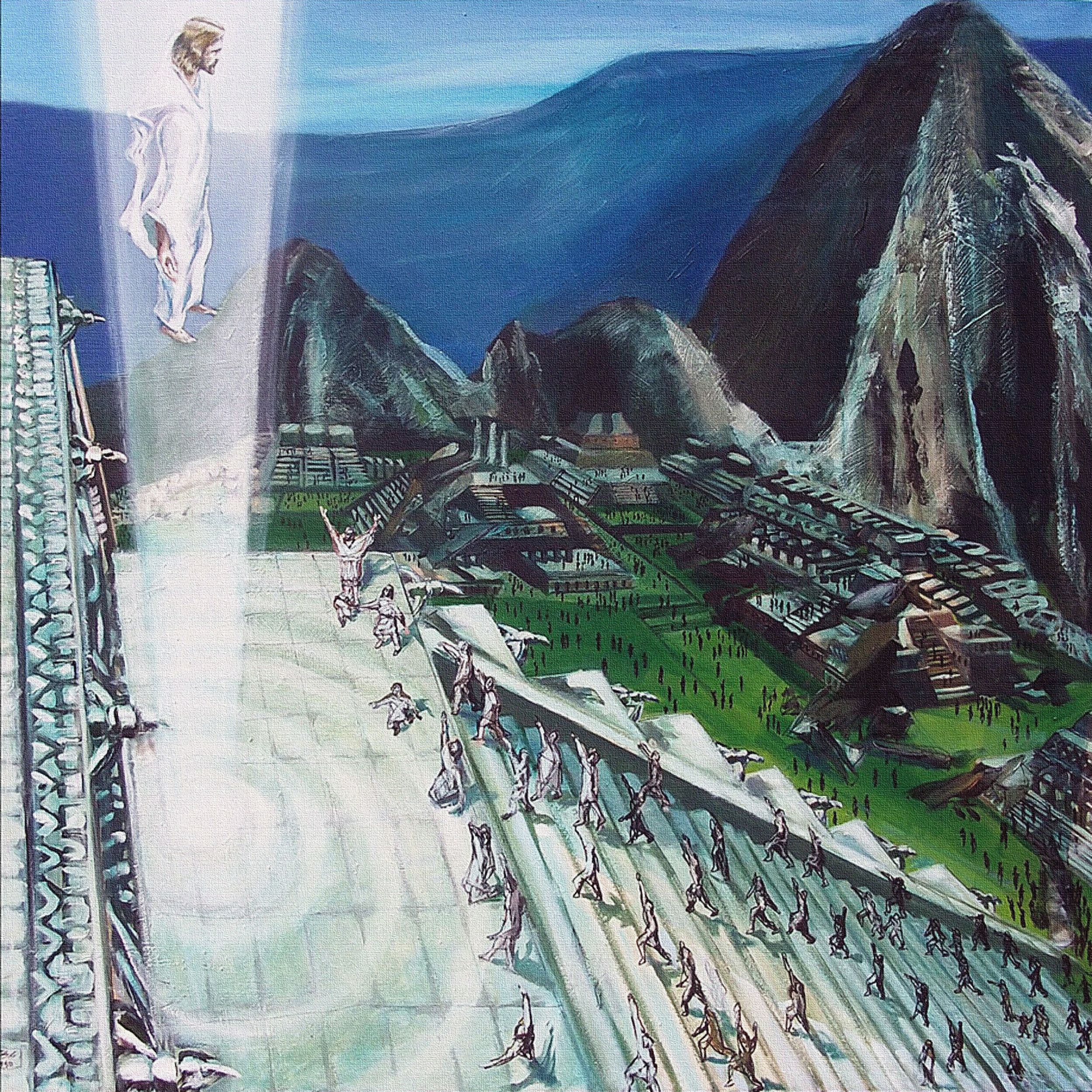 "On this painting, I wanted to show the Savior's descent into the American continent from his point of view, descending from above to visit his people below on this Earth."