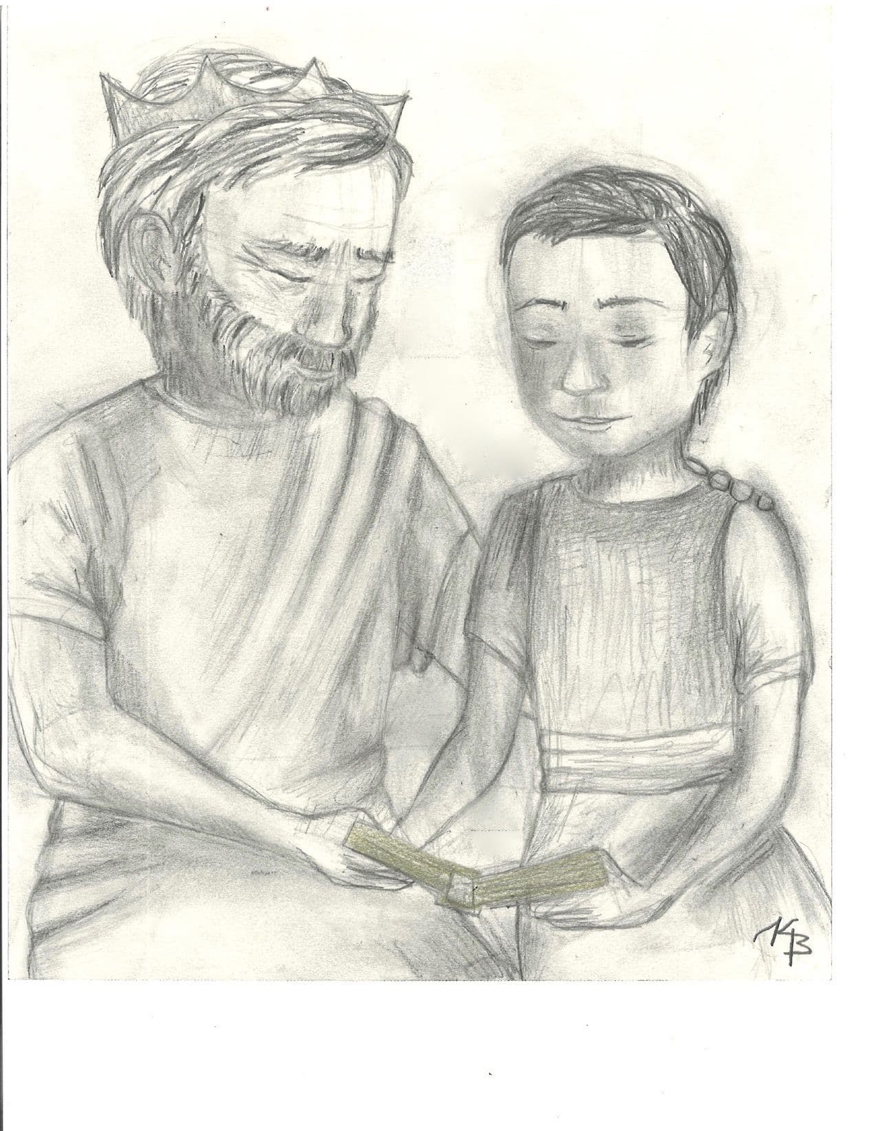 This is a pencil drawing of Omer, a Jaredite king, and his son Emer. After being in prison most of his life Omer finally reclaims his kingdom. He teaches his young son about the gospel, how to be righteous, and all the things that mark a great ruler.