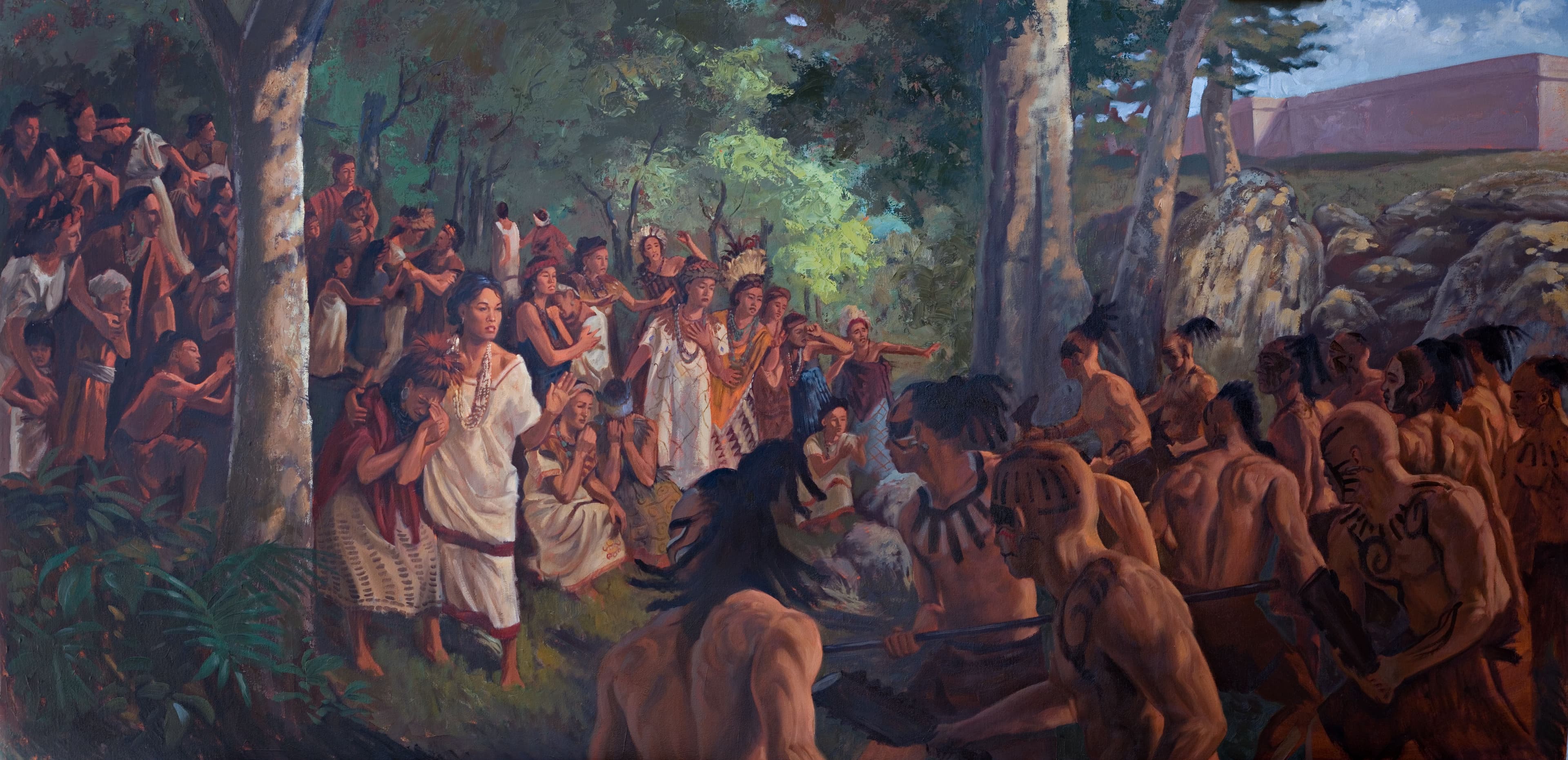 Pursued by a blood-thirsty hoard, abandoned by their king, Noah, and many of their men, without weapons and without hope, a group of Nephite maidens stopped their retreat and turned to face their attackers. Turning against the tide of horrified citizens, these daughters had to face an army, slaughtering men women and children, as they advanced straight toward them. If they failed all those they loved would die. They had to stand forth. And it worked. The Lamanites were charmed by their beauty and the slaughter stopped. The people were put in captivity, but they were alive thanks to the courage of their daughters.