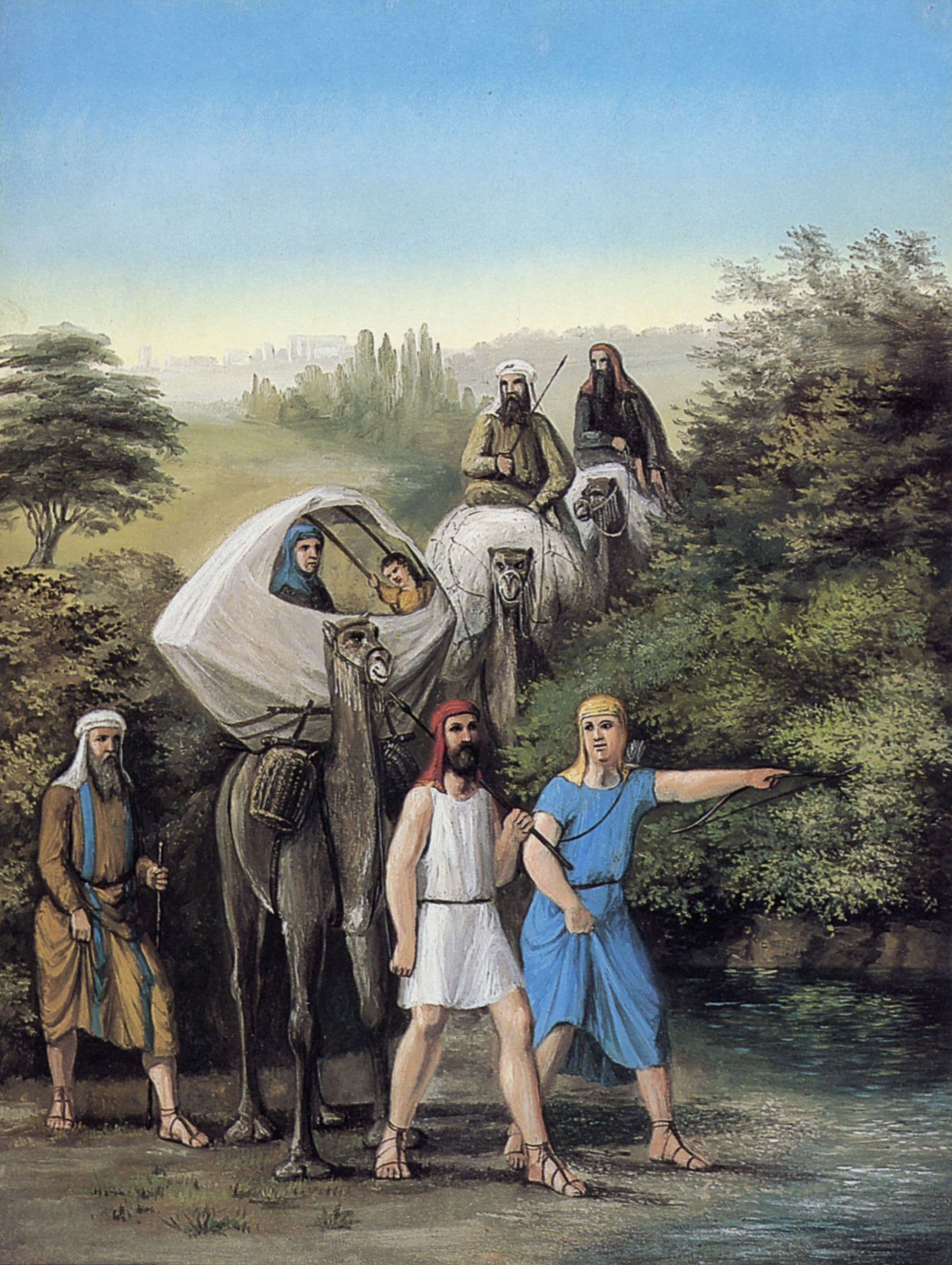 Lehi was warned in a dream that he should flee Jerusalem with his family to escape a plot to murder him. They left with only what was essential for extended travel in the wilderness. Christensen's art is a constant mix of naivete and sophistication. This is seen here in the clumsy but charming foreshortening of the camel and the carefully planted, hazy atmospheric perspective of the background.