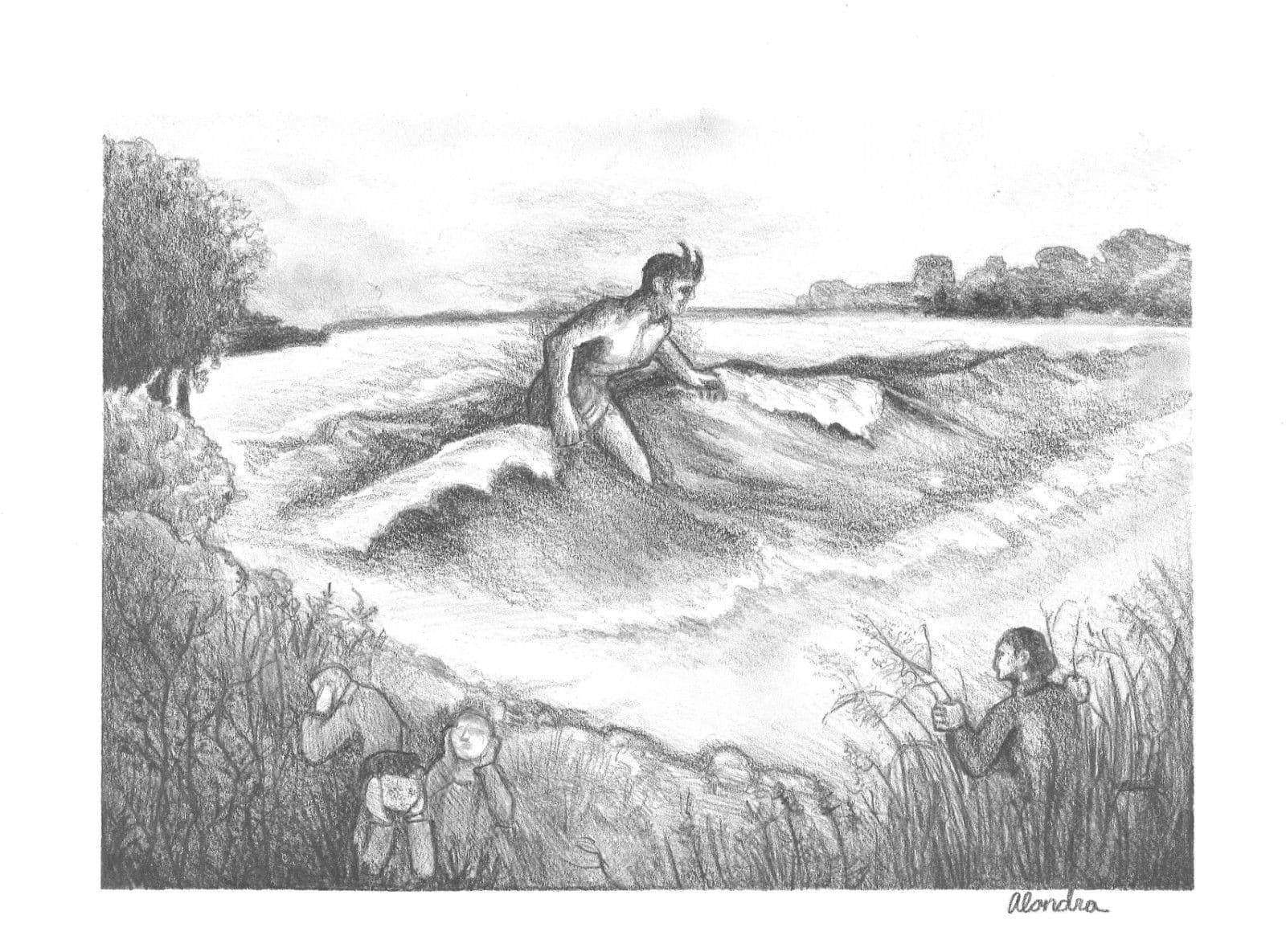 This drawing is a depiction of William W. Phelps's vision of the destroyer riding upon the waters, warning his traveling companions not to travel by the river, but by land. The vision took place on McIlwaine's Bend, a dangerous and historical part of the Missouri river. Phelps is seen at the bottom right corner of the drawing, while his companions are on the bottom left. Joseph Smith wrote that some were able to hear the vision, but not see it.