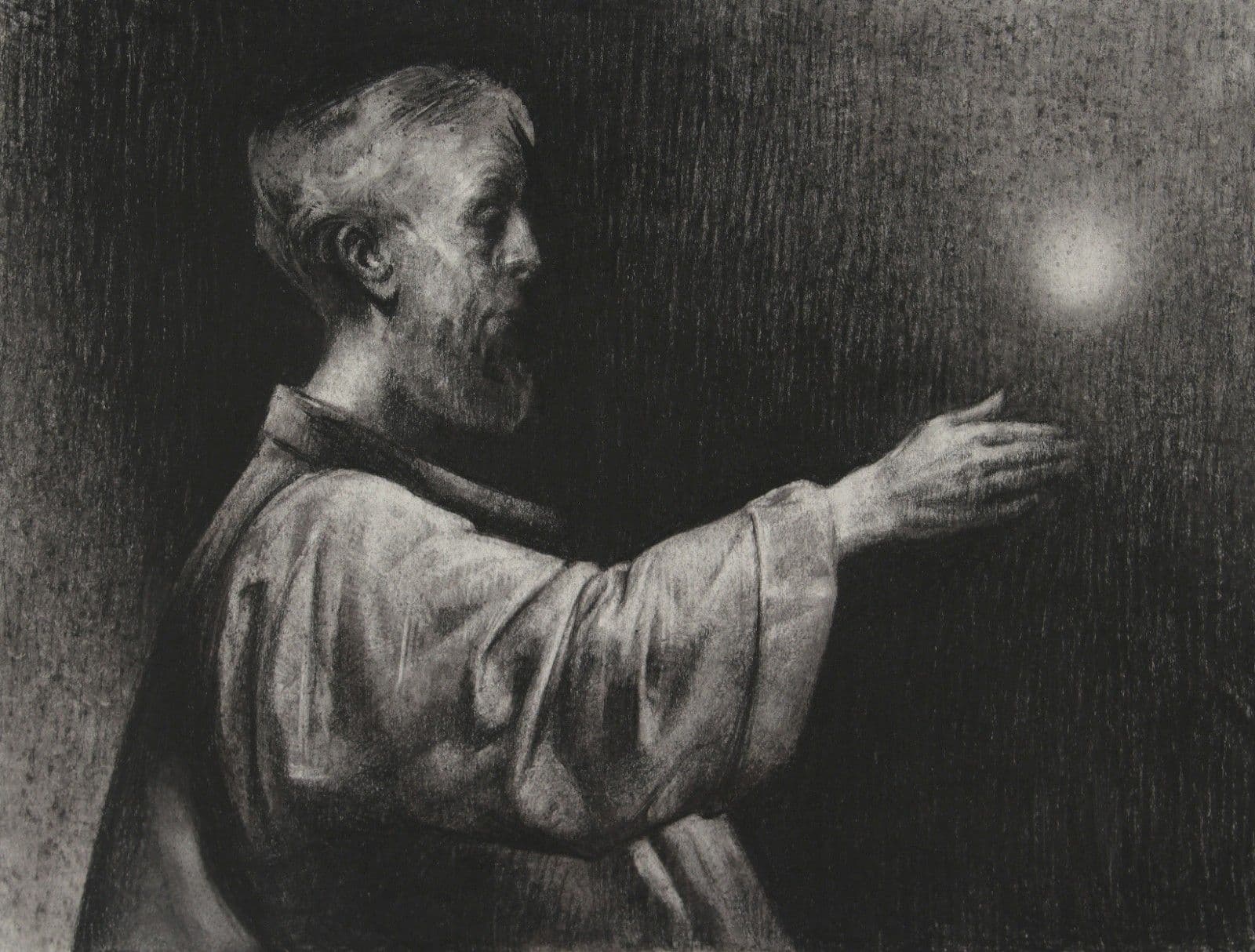 In Lehi's dream, the prophet wanders aimlessly in a dark and dreary waste with growing anxiety. He prays to God for mercy and immediately the Lord allows him to escape from the darkness. I love that moment of emergence, Lehi's certain relief at deliverance, that curiosity with his new surroundings, and above all his desire to taste of this mysterious fruit which he had never before encountered. I wanted to capture something of that in-between-worlds moment. The moment between sleeping and waking, between dream and reality, between light and dark, between anxiety and relief, between wandering and true conversion.