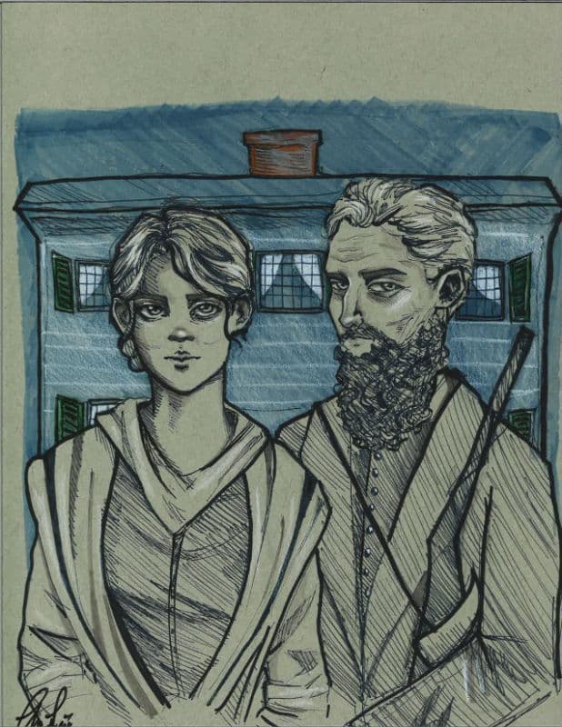 Elizabeth and Isaac Hale in front of their white, green-shuttered home. In “Hard Questions” a picture of "American Gothic" was used because there was no photos or paintings of Isaac and Elizabeth to be found. So using that format, the artist has depicted them in front of their home. Note that Isaac's rifle and powder horn which are displayed in the home today are being held and worn by Isaac Hale. This piece is dedicated to Lynne Wilson so that she doesn't have to use "American Gothic" anymore. ;)