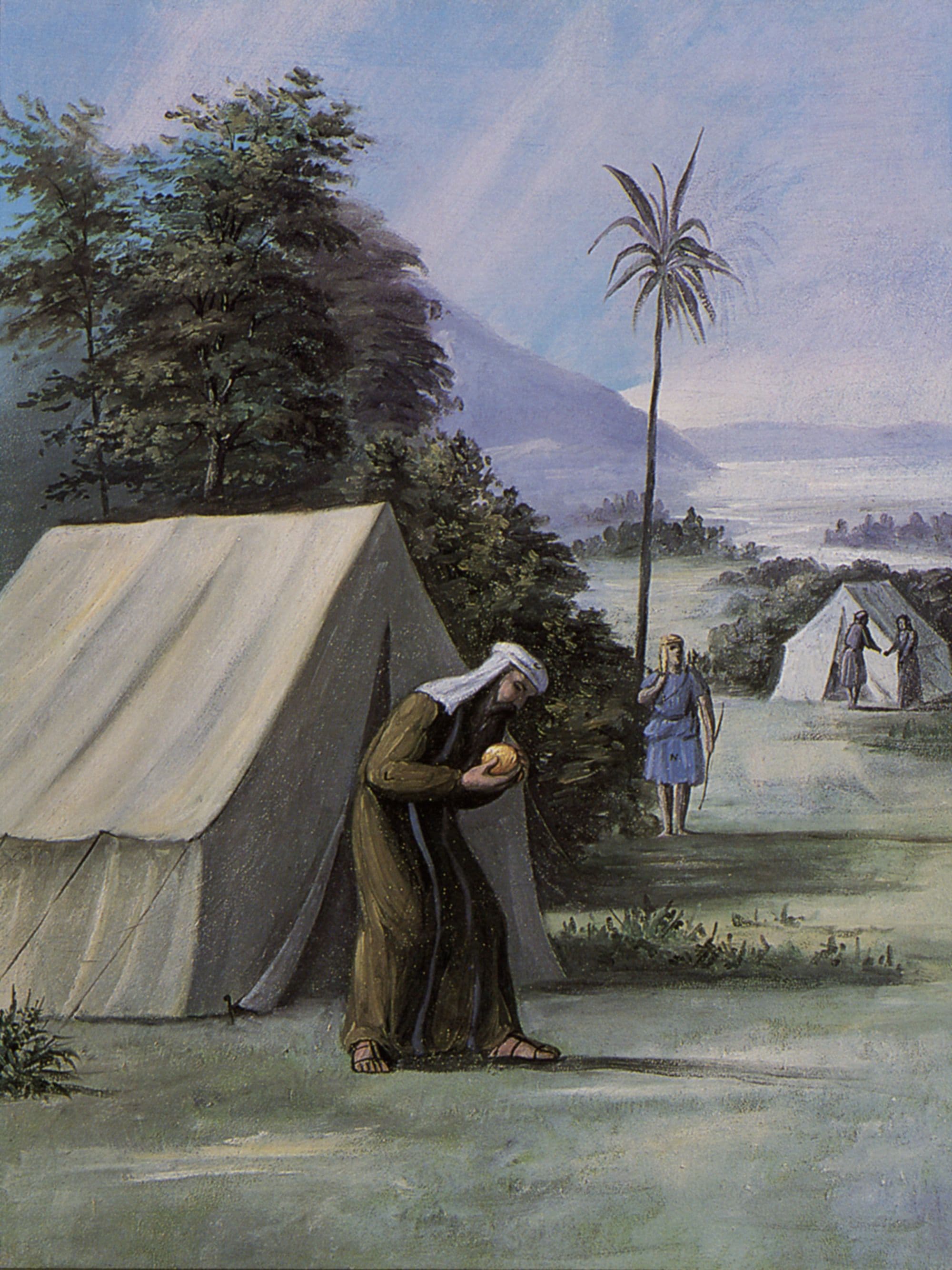 Commanded to continue his journey through the wilderness of the Arabian Peninsula, Lehi found "a round ball of curious workmanship," enclosing two spindles (1 Nephi 16:10). One spindle was understood to indicate the direction in which he should travel. In the background, Nephi, dressed in blue, returns from the hunt with his bow. As the subject of this series of paintings, Nephi is included in all the paintings, even if he is not he central character in a particular scene.