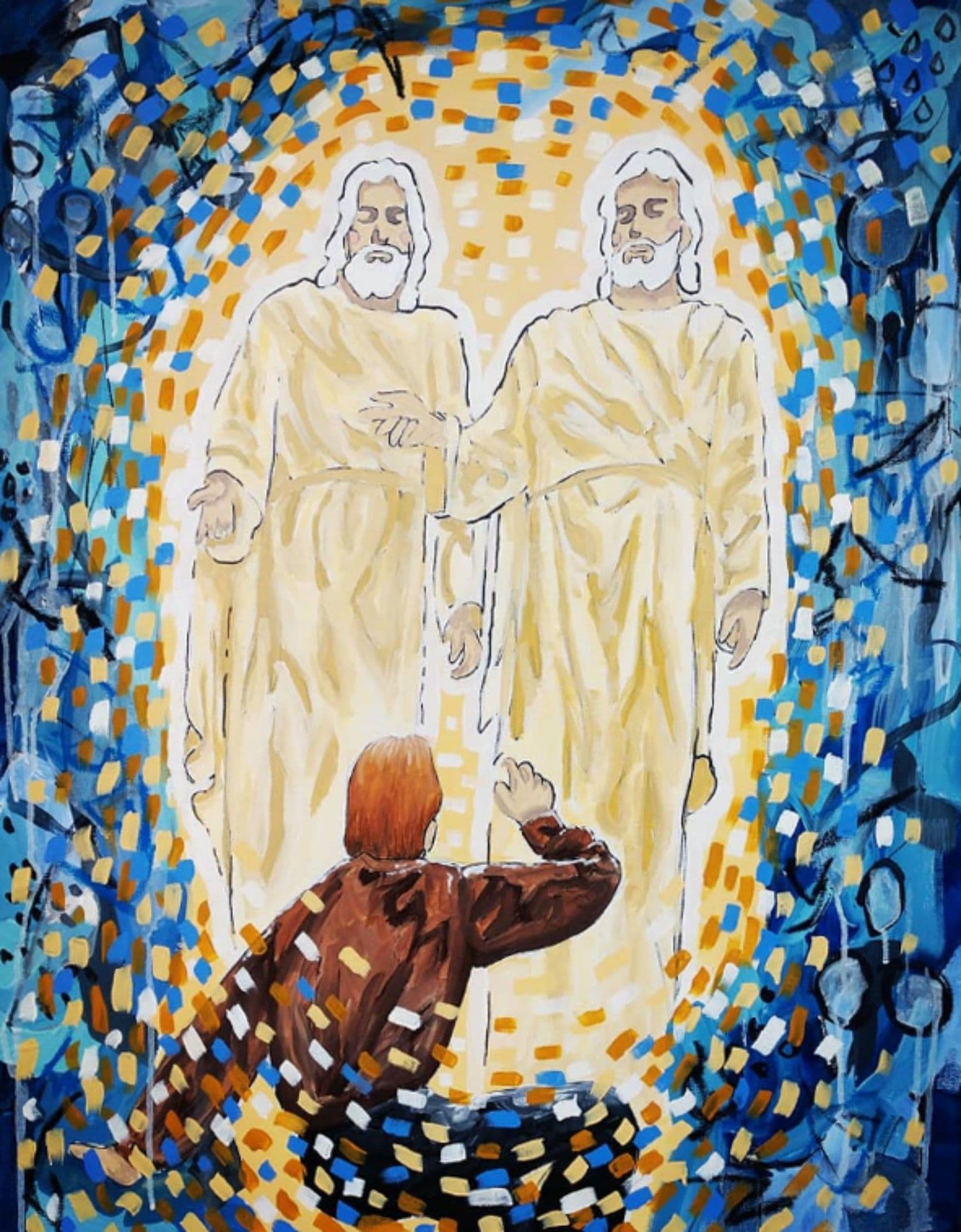 24X30 Mixed media on stretched canvas. This piece captures the feeling of the moment, the absolute whirlwind emotion that Joseph Smith must have felt the moment the Heavens opened again. This piece celebrates this incredible moment when Light once again beat the darkness.