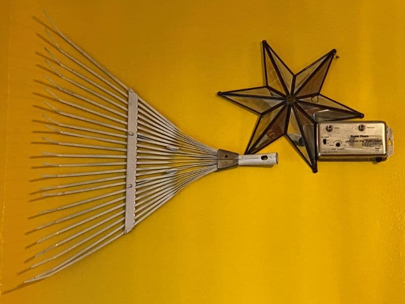 3 Nephi 21: An abstraction of the angel flying through heaven with the everlasting gospel to go forth to all nations, kindreds, tongues and people. The rake directly represents the gathering of Israel (v 28); also the legs and skirt of the angel. The 6-pointed star is indicative of the ongoing work of the Lord and the 12 facets, each with 3 points, represent the perfect organization of the restored gospel; also the head of the angel. This work can only be accomplished via the direction of the Holy Ghost (v. 2) gained by our constant striving to hear Him; also the arms of the angel.