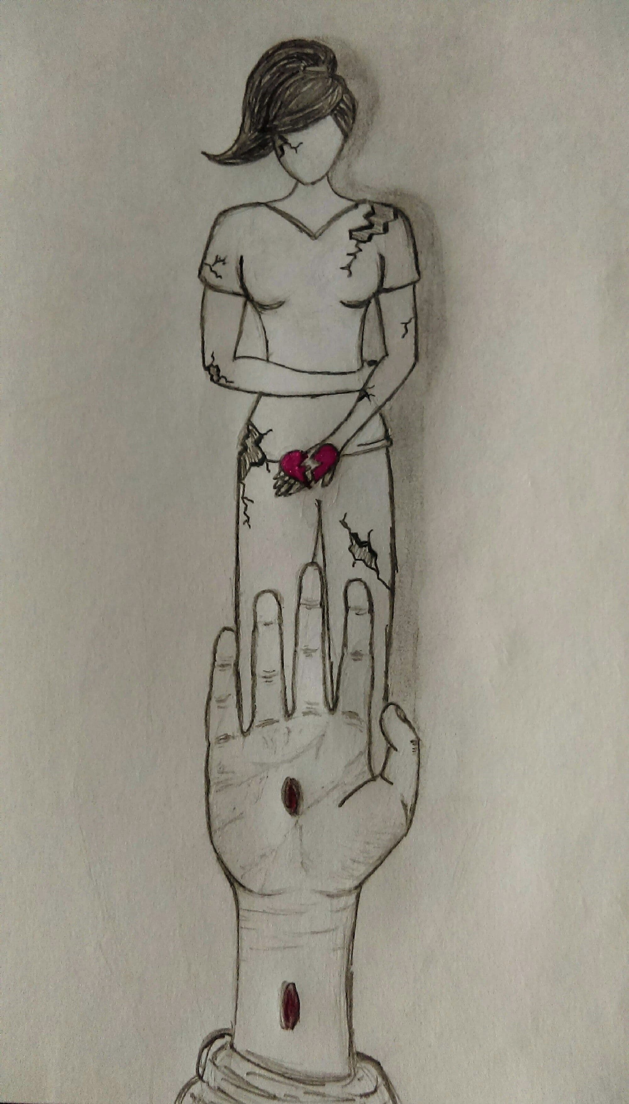 The young woman in the piece represents all of us. She is broken from all the trials and sins and mistakes that have happened in her life. Her heart is broken in two, in desperate need of healing. The Savior's hand reaches for her heart as she offers it to Him. He is there to fix her brokenness through the Atonement, the signs of His ordeal written on His hands, just like the cracks on the young woman. He knows her brokenness and knows how to heal it.