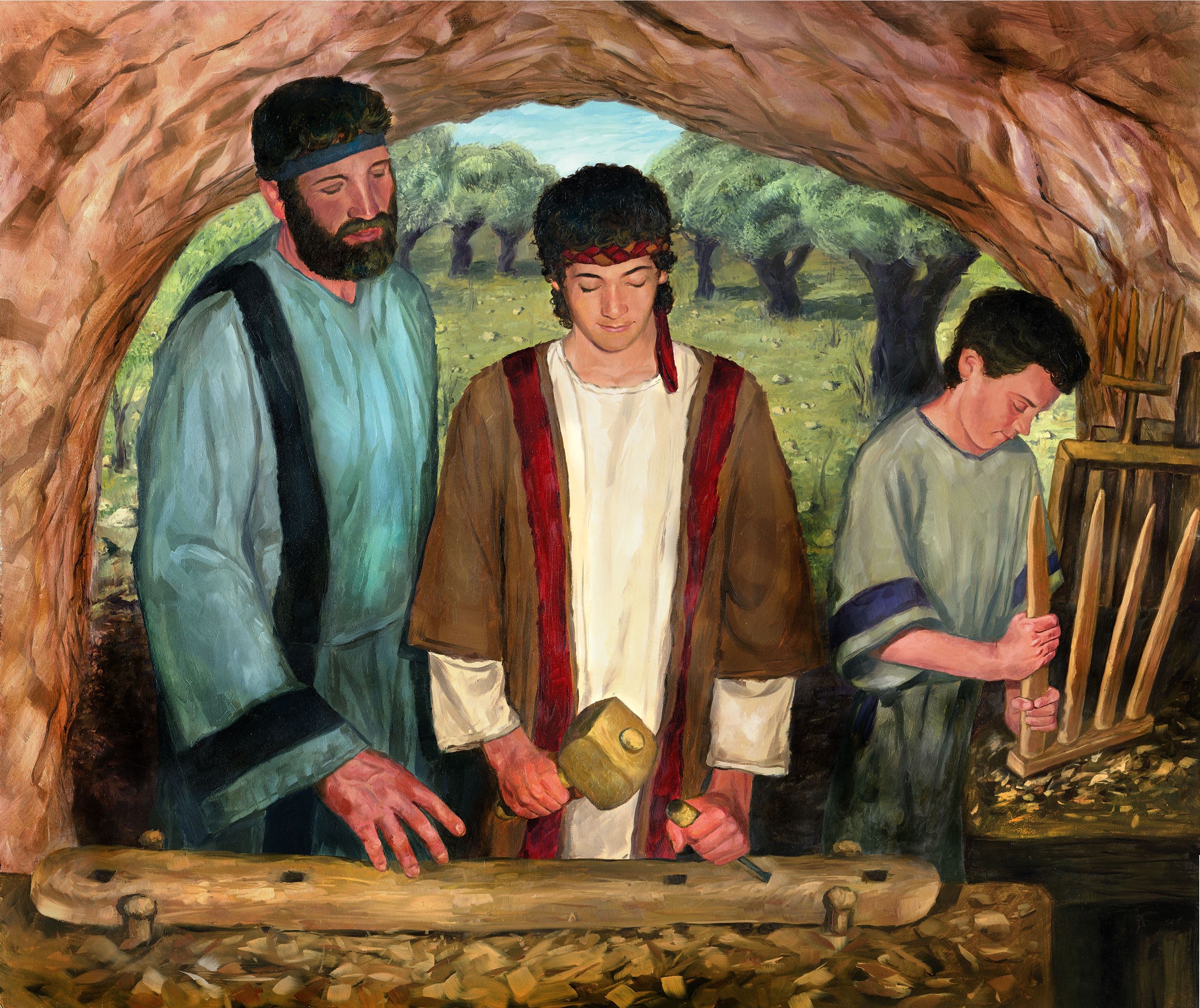 "This piece is inspired by Mosiah 14:2 'For he shall grow up before him as a tender plant, and as a root out of dry ground; he hath no form nor comeliness; and when we shall see him there is no beauty that we should desire him.' Jesus grew up in humble circumstances, with no special honors or privilege, working every day by the sweat of his brow. In the painting, Jesus is shown as a youth learning the trade of a carpenter from his Father Joseph, constructing a yoke, which forshadows his future mission of bearing the burdens and sins of all mankind, (also mentioned in Mosiah 14:4 'Surely he has borne our griefs, and carried our sorrows; yet we did esteem him stricken, smitten of God, and afflicted.') James, the younger brother of Jesus, is also shown following the example of his older brother Jesus, just as we follow the example of our Savior and work with Him (Jacob 5:72). The figures are pictured in a limestone cave or grotto, common to the area of Nazareth, and outside an orchard of olive trees is shown, symbolizing the house of Israel (see Jacob 5) who benefit most from the Savior's work upon the earth."