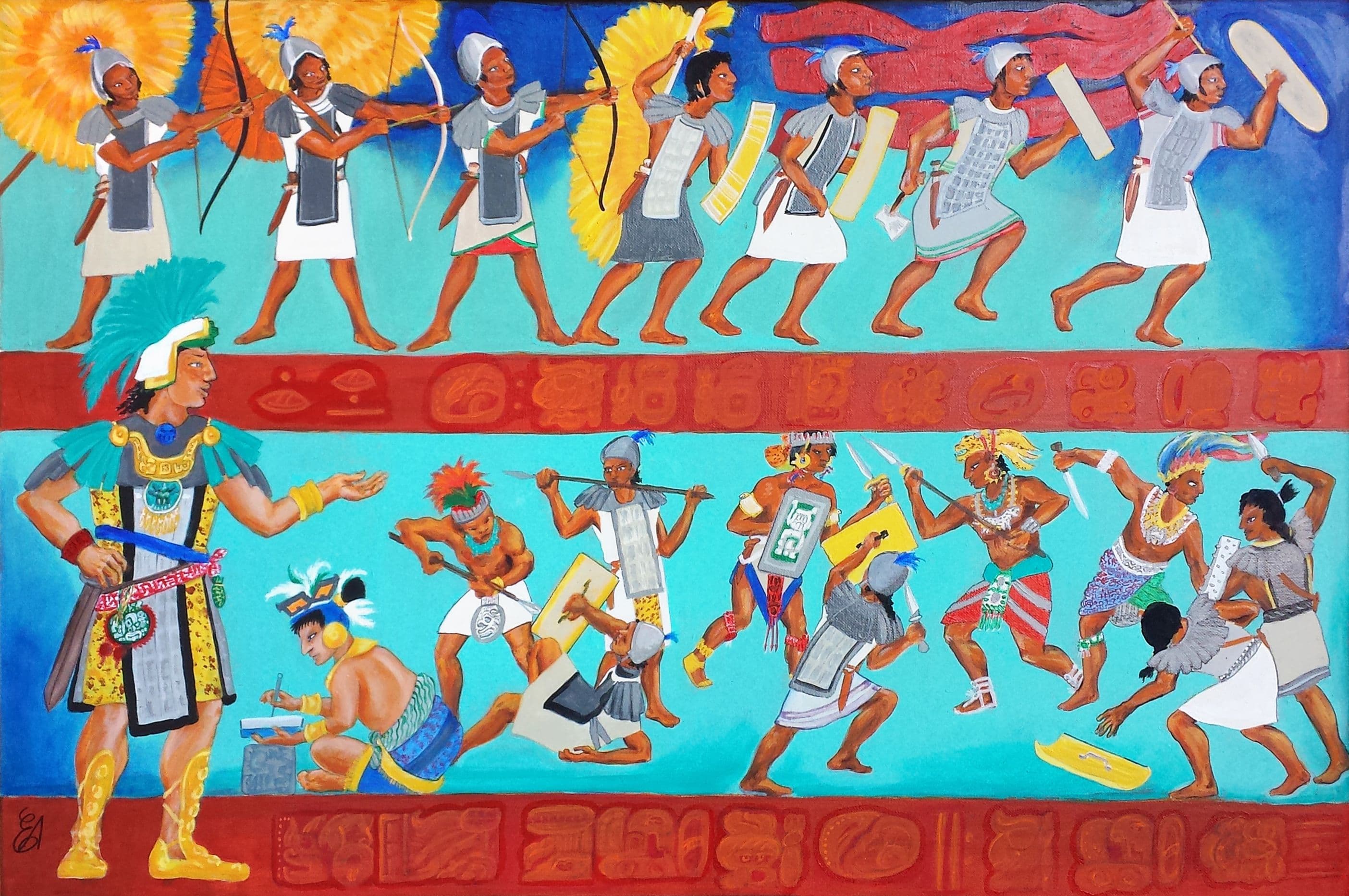 The style and the colors are representative of the Mayan culture. Elena studied art in at the Panamericana School of Art in Argentina with an emphasis in the human body. She specialized in oil and acrylic painting. She later studied medieval painting style and Ancient American painting styles
