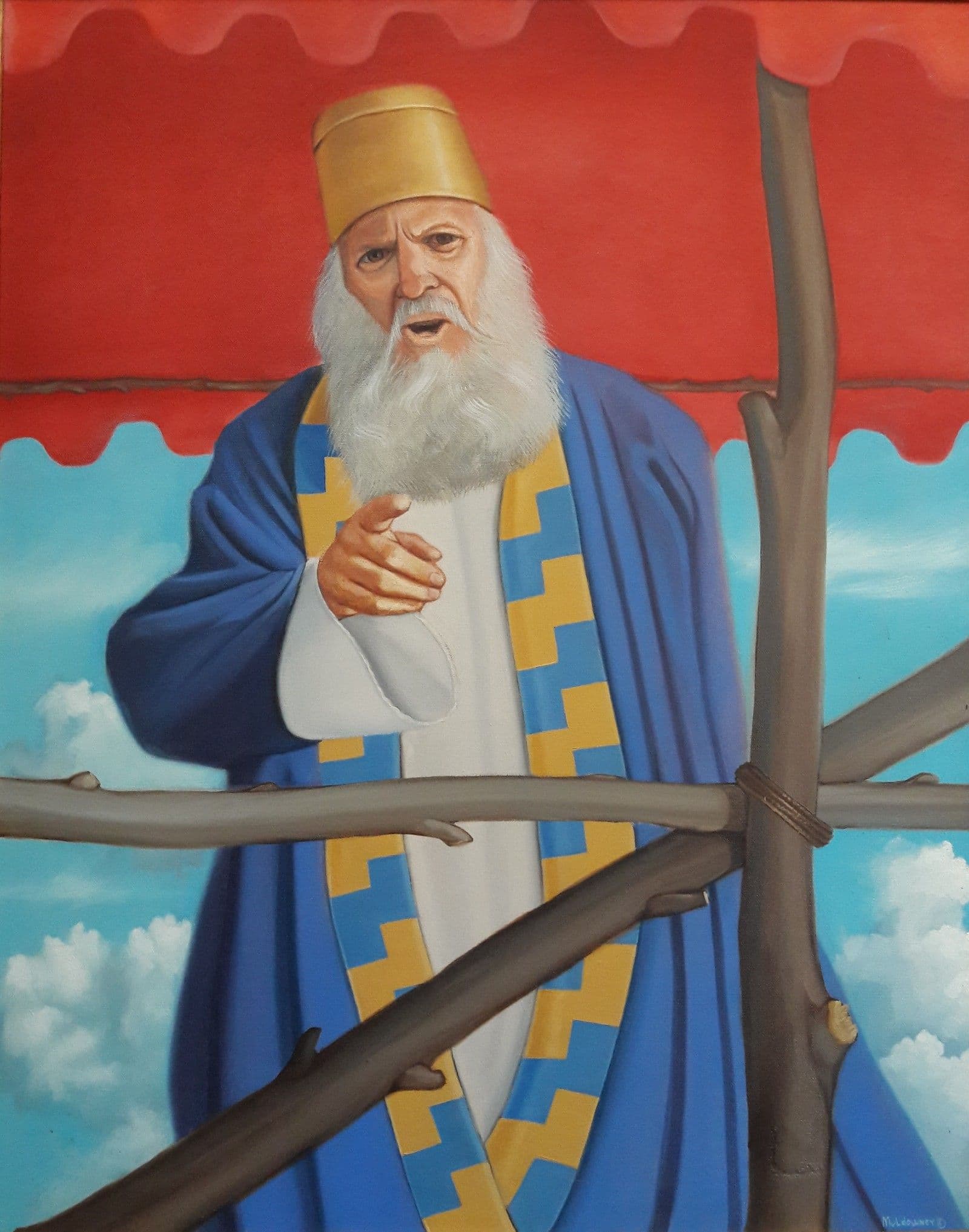 Before he died, King Benjamin bore his testimony at the coronation of his son Mosiah. Based on the details of Mosiah chapter 1 through 6, it is likely this occurred at the Sukkot celebration which was the customary time of a coronation. The theme of Sukkot is deliverance. King Benjamin took this opportunity to teach his people about the ultimate deliverance from sin through the infinite sacrifice of Jesus Christ. This painting represents King Benjamin on the ‘migdol’ bearing his last testimony to his people (Mosiah 2-6).