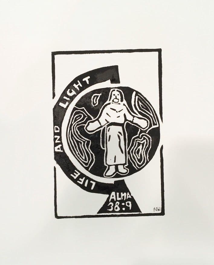 "This art is based on part of Alma 38:9, which says, 'There is no other way or means whereby men can be saved, only in and through Christ. Behold, he is the life and the light of the world.' As I made this print, I reflected on the story of Alma's son, Shiblon, and how he was able to turn to Christ through persecution and hardship in his life. This print shows Christ filling the world with His hands outstretched towards all of us. As with Shiblon, Christ is reaching out to each of us, no matter where we are in the world or our spiritual journeys, and we can always come to Him."