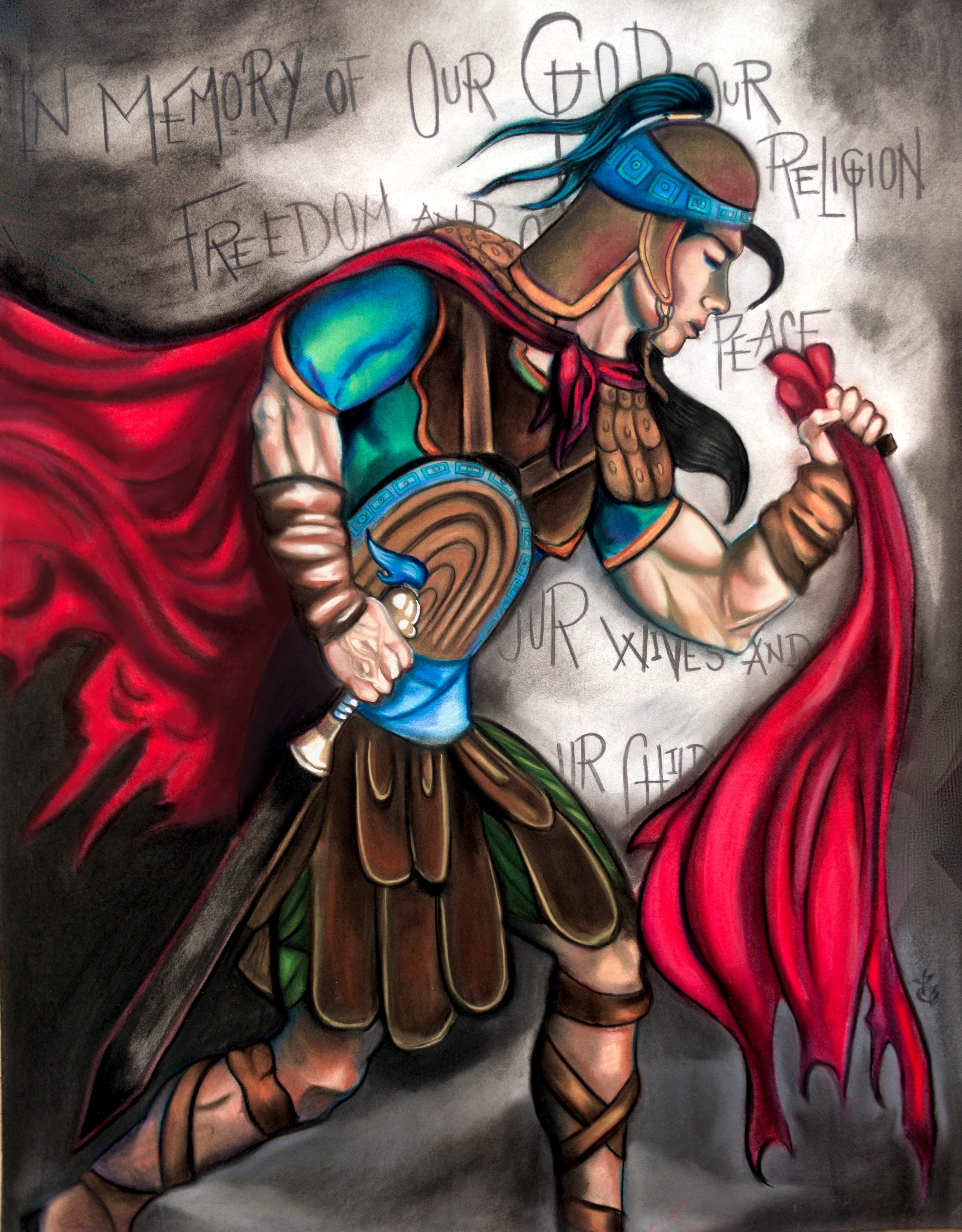The chapters in Alma chronicling Captain Moroni's battles to keep the Nephites free are some of my favorite. I wanted to depict Moroni as the passionate young man he is described as, as a warrior, in the act of rending his coat (or cloak!) with the idea of writing and then raising the Title of Liberty in his mind.