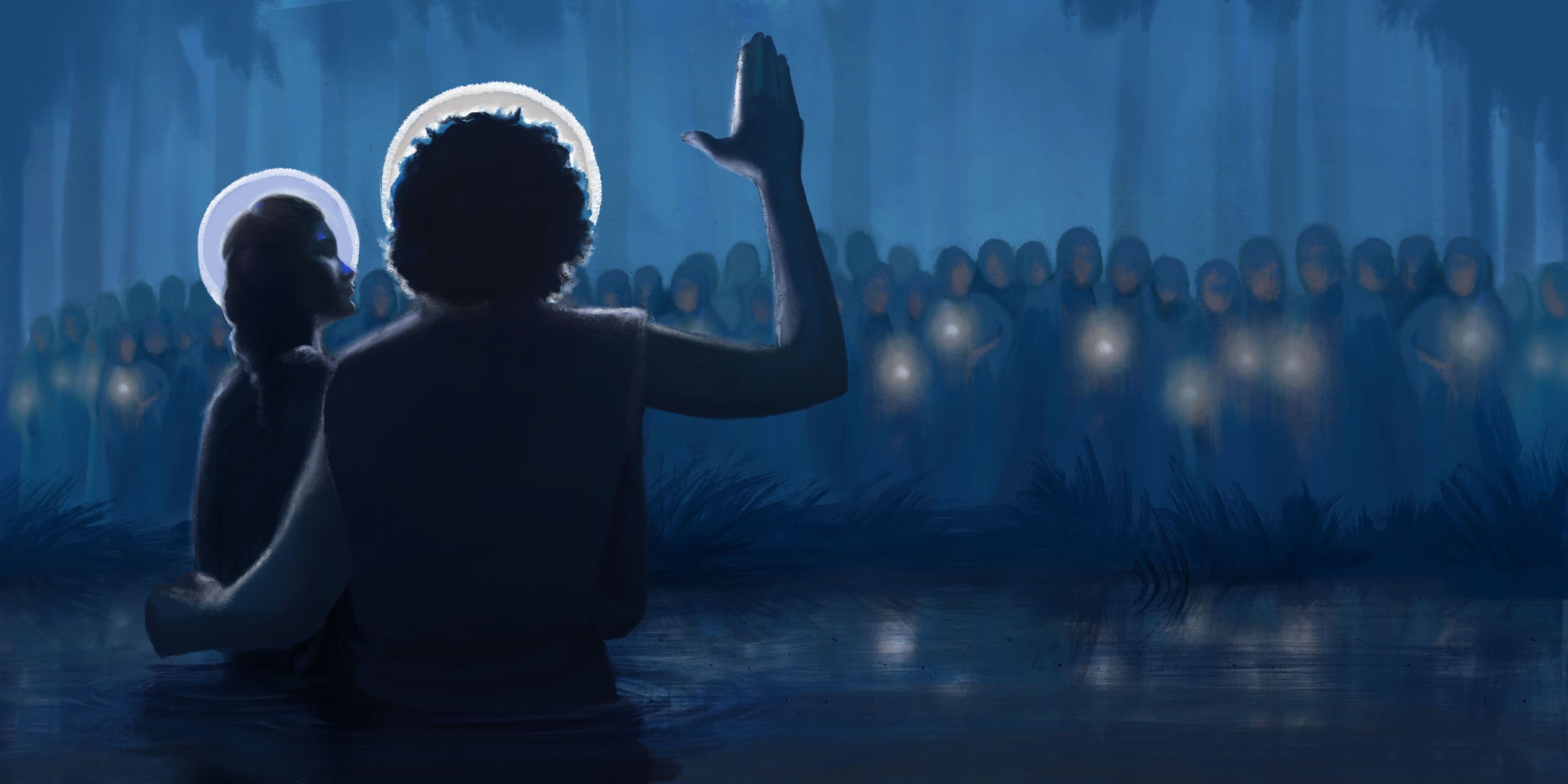 The point of view of this image and the time of day are meant to help the viewer remember that these meetings were held in secret. Alma hid from the king’s searches during the day, so his meetings could very well have been held in the evening.