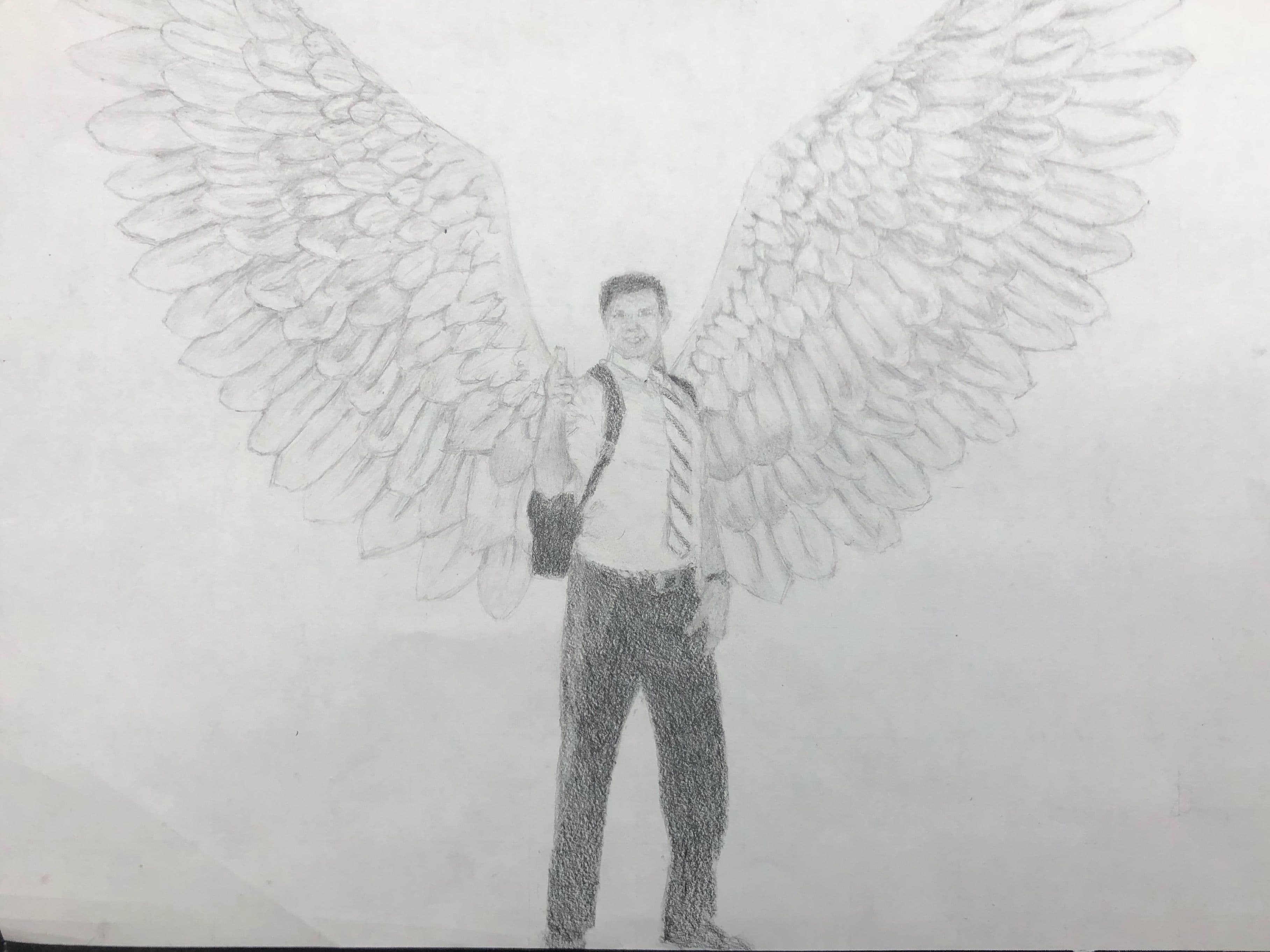 "This piece is graphite on paper. A missionary is standing confidently in front of a set of angel wings. The artists was inspired to draw this picture after receiving a photo of his brother standing in front of these beautiful angel wings in Poza Rica. Missionaries are often seen as angels, sharing the Gospel of Jesus Christ. Many converts remember the way a missionary taught them or the Spirit in the room as a missionary taught them. It is by the mouth of Angels that people hear the joyful Word of God."