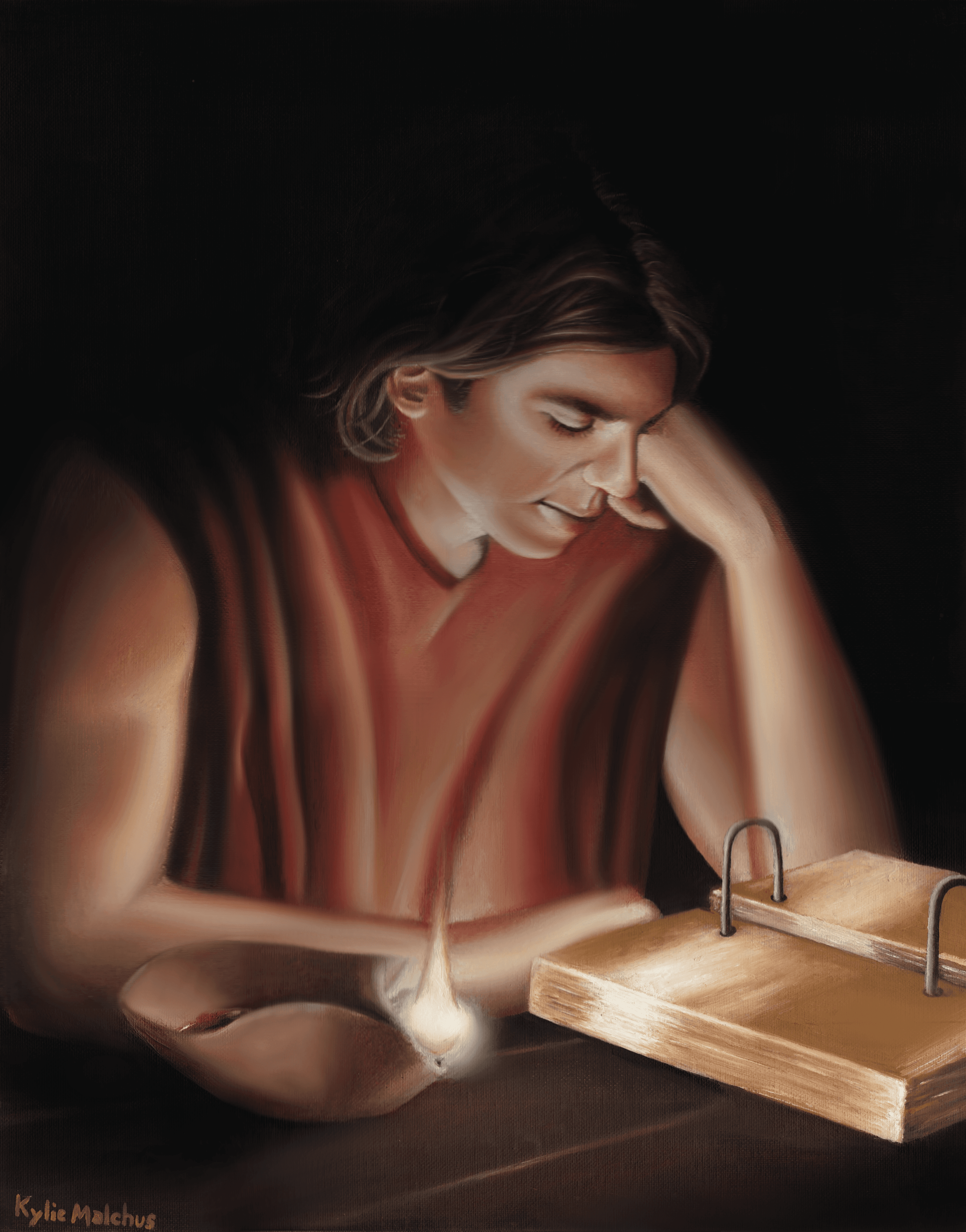 This is my depiction of Nephi studying Isaiah out of the brass plates. In order for Nephi to have such a unique understanding of Isaiah's prophesies, he must have dedicated countless hours to studying, pondering, and praying about his words. I like to imagine he studied by night, perhaps the only free time he had in the midst of journeying in the wilderness, hunting, and ship building. I depicted Nephi reading by the light of an Iron-Age-style oil lamp, which would've been typical around 600 BC. Nephi is a personal hero of mine and it was a privilege to paint my vision of him. His love for the scriptures inspires me to search them more carefully and liken them unto myself. This oil painting was done on a 16x20 inch canvas board.