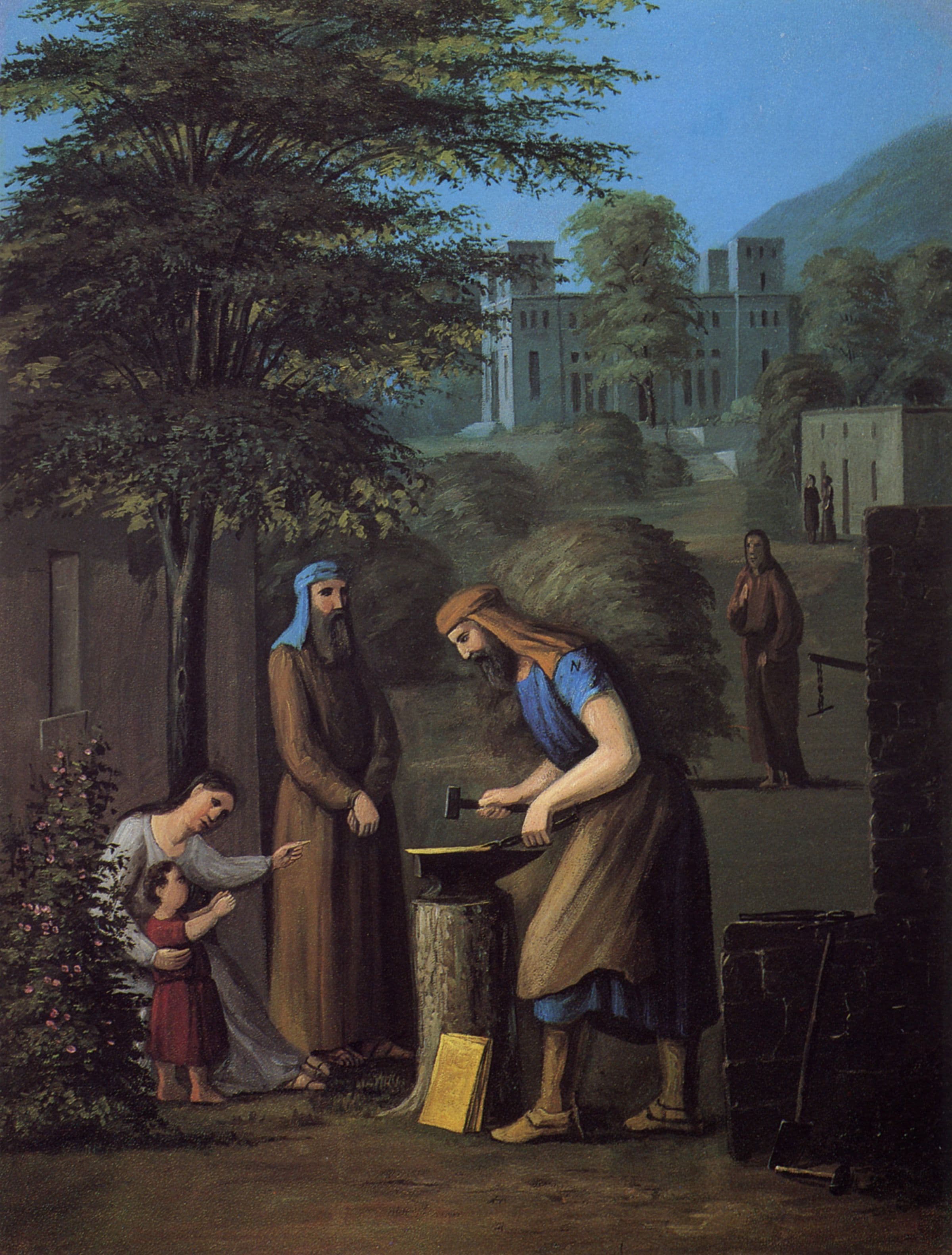 Lehi and his people sailed to the American continent. There, Nephi fulfilled a commandment to create records of his people by refining ore and producing metallic plates. He then inscribed his own account on the plates. The inclusion of a blacksmith's tools and forge show Christensen's keen observation of his own environment. The large building in the background looks like a palace from the Italian Rennaisance, strangely out of place in the New World hundreds of years before Christ. No doubt Christensen was prompted by his familiarity with the European tradition of idealized landscapes of the seventeenth and eighteenth centuries.
