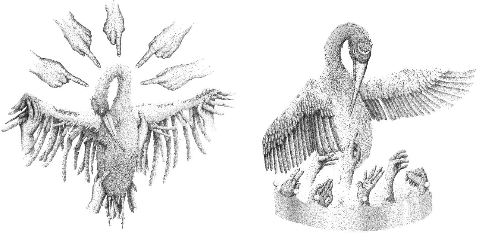 In a recently completed diptych, I reinterpret this myth in an act of modern iconography. The first piece depicts Christ, symbolized by the battered, beaten, and bleeding pelican. Hands are shown lifting him high, while pointing fingers crown him with thorns. This is Christ, The Defenseless and the Judged.