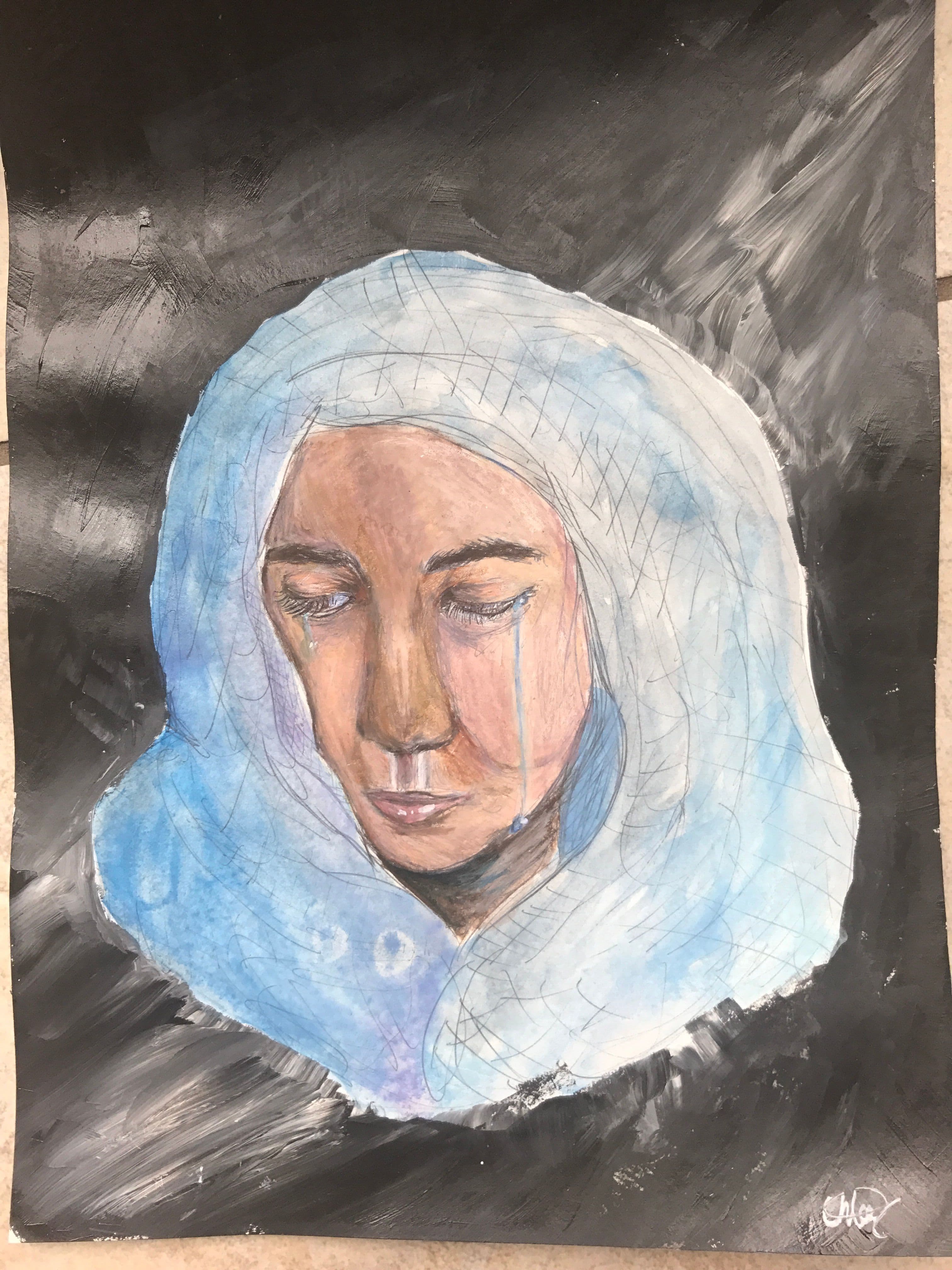 Honorable Mention - Youth Division in the 2017 Book of Mormon Central Art Contest This work depicts the sorrow she must have felt not knowing if she will ever see her sons again after they went back to Jerusalem to obtain the brass plates.