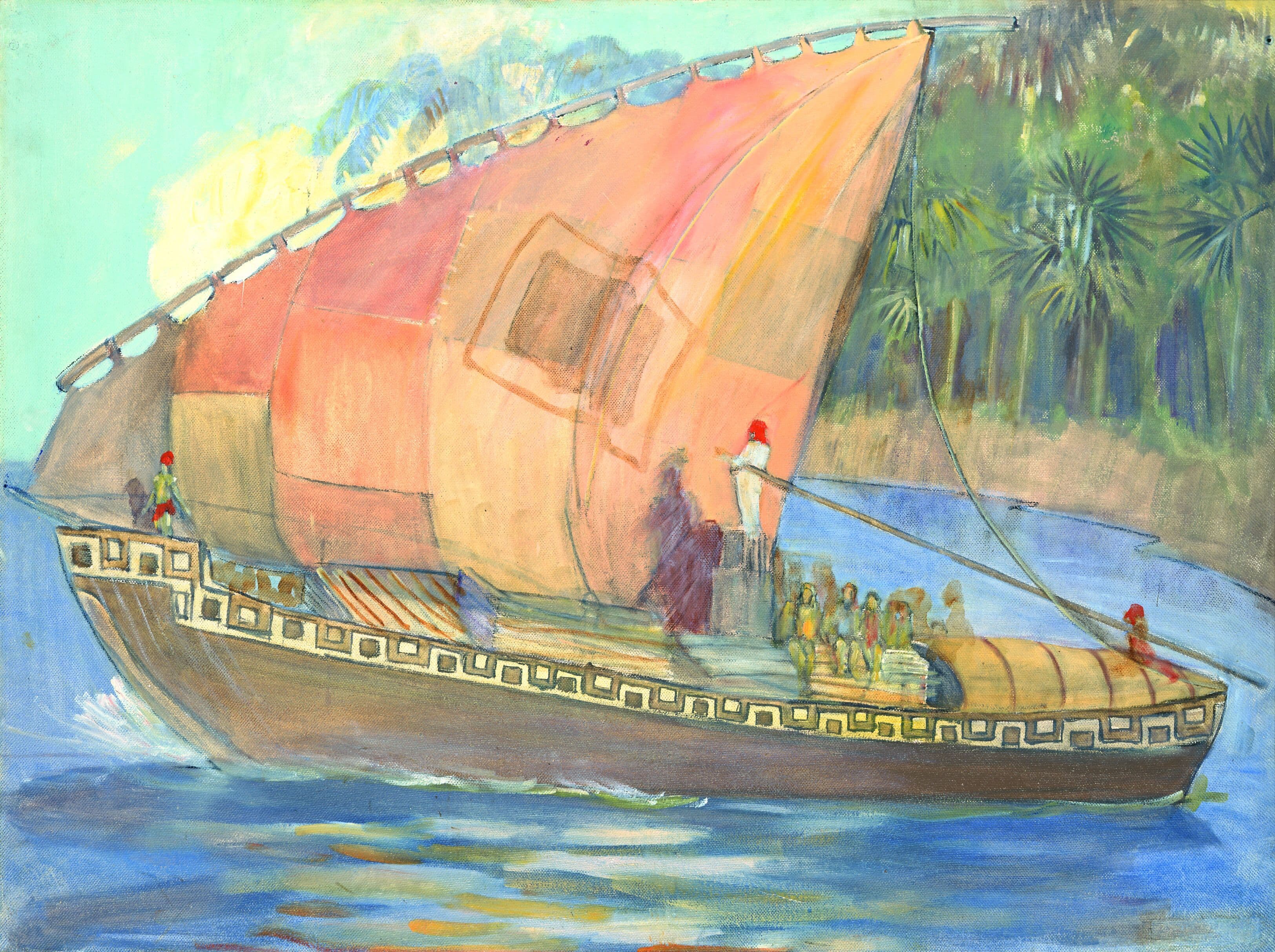 Although the destination of Hagoth’s ship is uncertain, the lines of the sail, the prow, and the rudder point forward, as do the crew mem-bers and passengers, and the sky and water are peaceful. Anticipation rather than fear or concern seems to dominate. The water splashes forward of the boat. Teichert, who spent most of her life in a mountainous desert, apparently did not understand the action of boats against water as well as she understood the movement of animals.