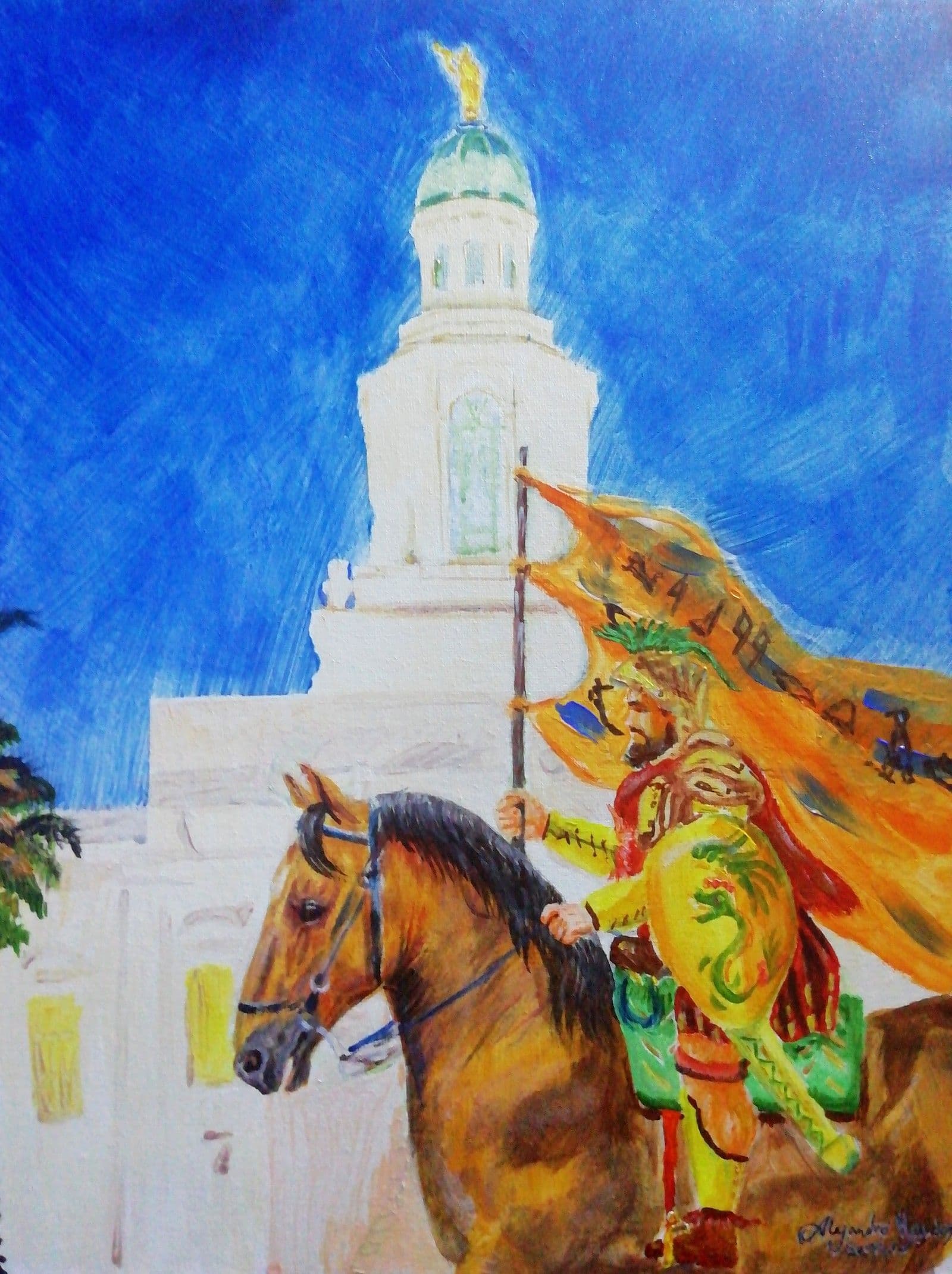 This piece is based on the Come, Follow Me class for Doctrine and Covenants 64-66 and is called Sión será un “Estandarte al pueblo.” In the painting, you can see Captain Moroni holding the title of liberty in front of the Concepción Chile Temple and with a Quetzalcoatl shield.