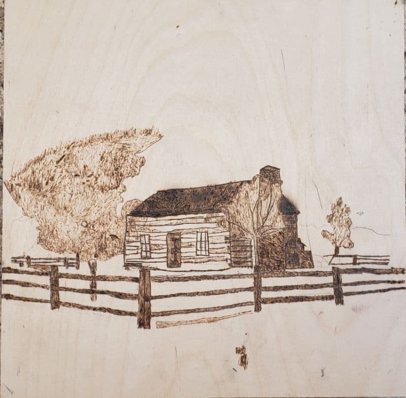 The artist is self-taught. He likes to wood burn animals and landscapes.