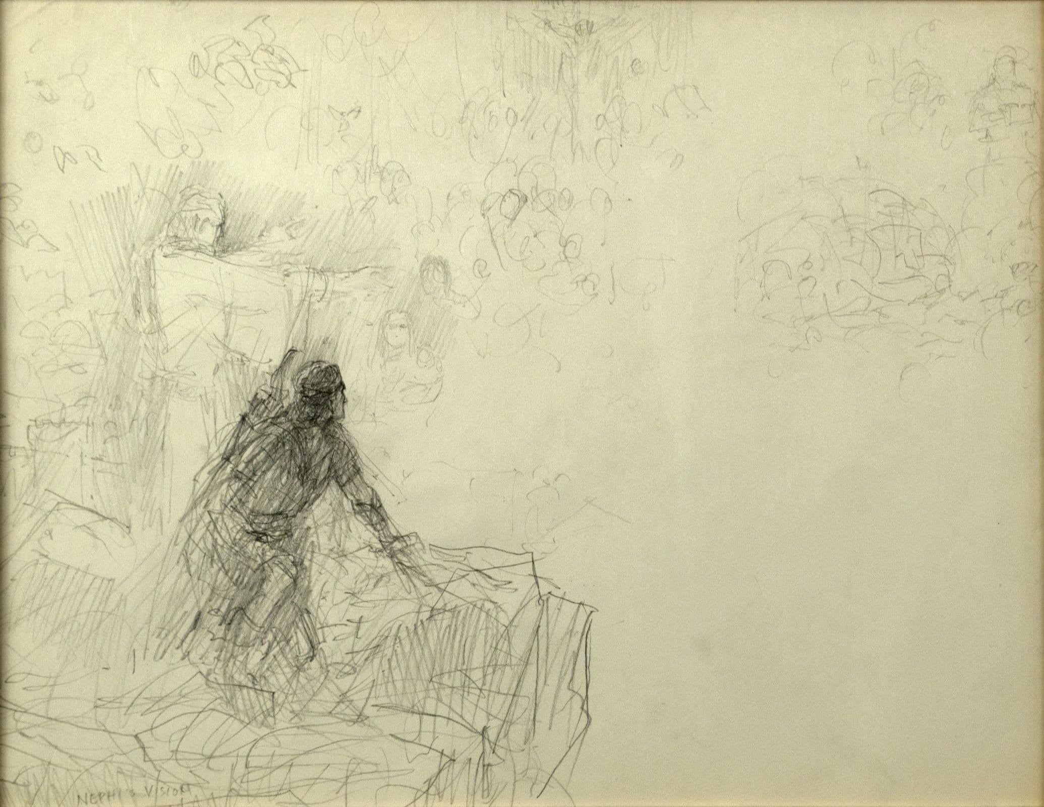 In addition to creating several versions of Lehi’s Vision of the Tree of Life, Friberg did several works portraying Nephi’s vision, which are recorded in greater detail in the Book of Mormon than those of his father. Whereas Lehi’s vision is prompted by reading the brass plates, Nephi’s vision is instigated by a humble prayer to see what his father saw. As recorded in 1 Nephi, chapter 11: