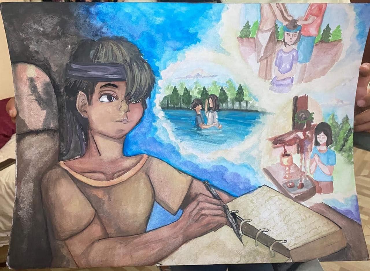 This work is based on the Moroni 1–3, Moroni is writing what Jesus taught them when he came to the Americas in 3 Nephi. Mildred Flores is from Mexico City, Mexico She is 14 years old, has always liked drawing, and loves being a member of the Church.