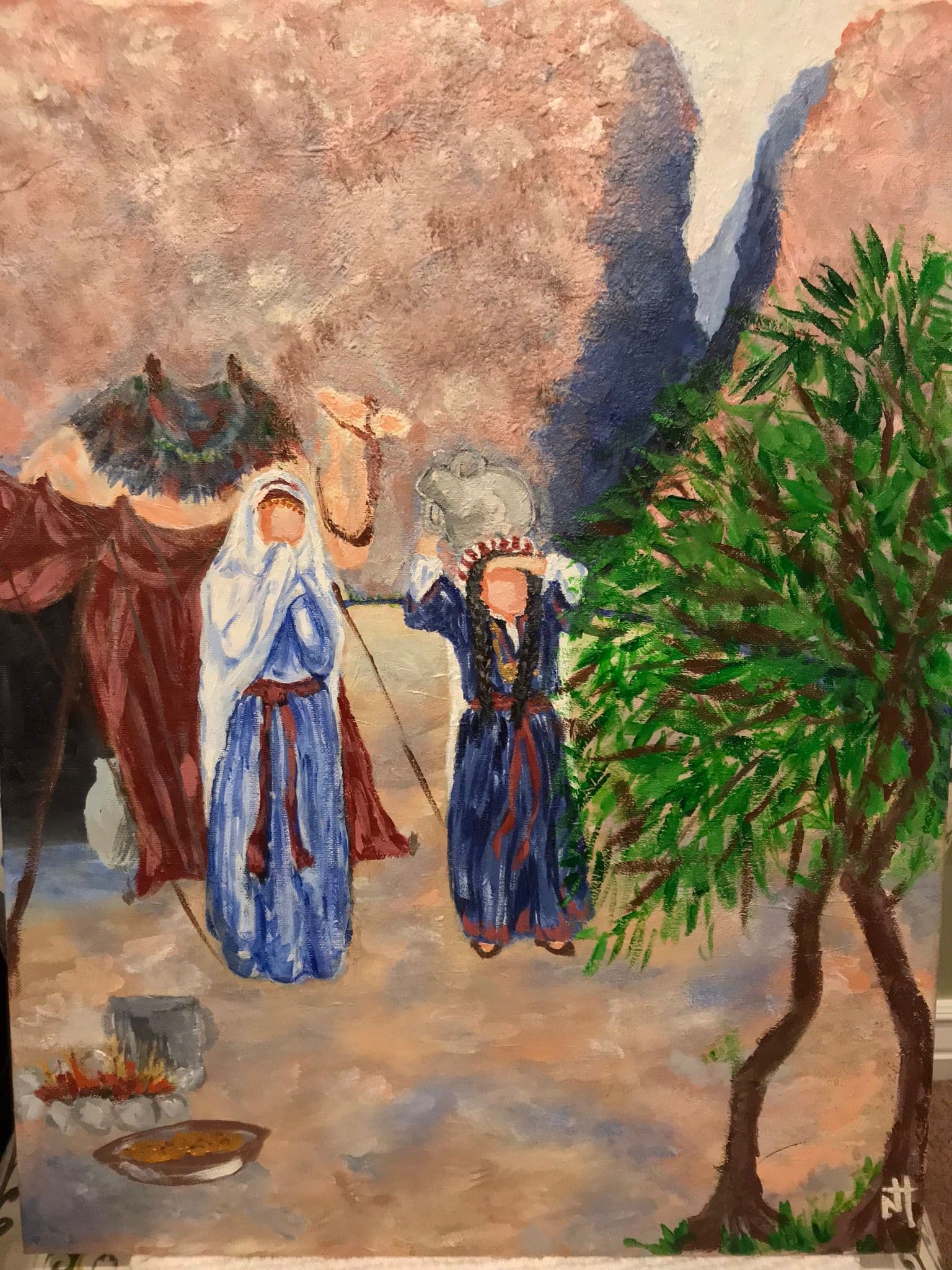 As a mom, I always wondered how would I react if I had to leave my home for a new land, and then have to bid my sons farewell as they returned to Jerusalem to get the brass plates. I would have been worried sick and I would have stood, like Sariah worries and waiting each morning and night for them to return. I painted Siarah stop cooking as her daughter brings water from the river to stand with her and gaze in the direction of Jerusalem waiting for her sons.