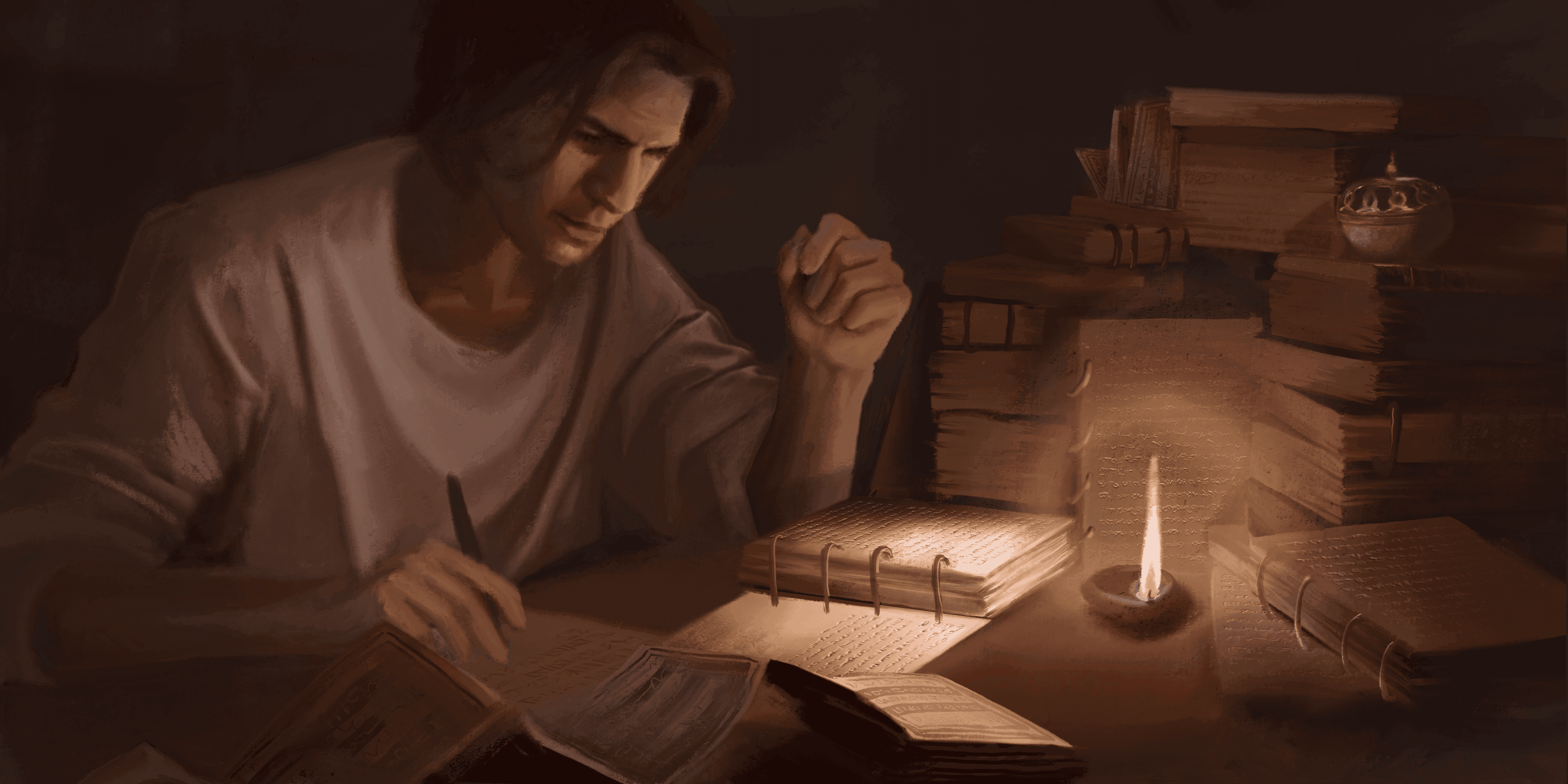 Curating the testimonies and witnesses of the Book of Mormon must have taken an enormous amount of research, planning and prayer. The stacks of plates and resources on the desk in combination with Mormon writing out a draft first, is meant to help the viewer ponder on how Mormon magnified his call.