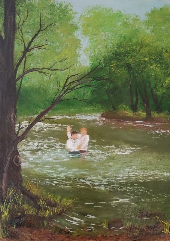 My inspiration for this painting was from Doctrine and Covenants 13 and JS–H 1:63-76. Oliver Cowdrey is the shorter one with brown hair, Joseph is the taller one with lighter hair. The painting shows when Joseph was baptizing Oliver Cowdrey. I wanted to portray how important that event was to the church. And how important it still is. I used oil paints for my medium. The actual size is 8 by 10 canvas.
