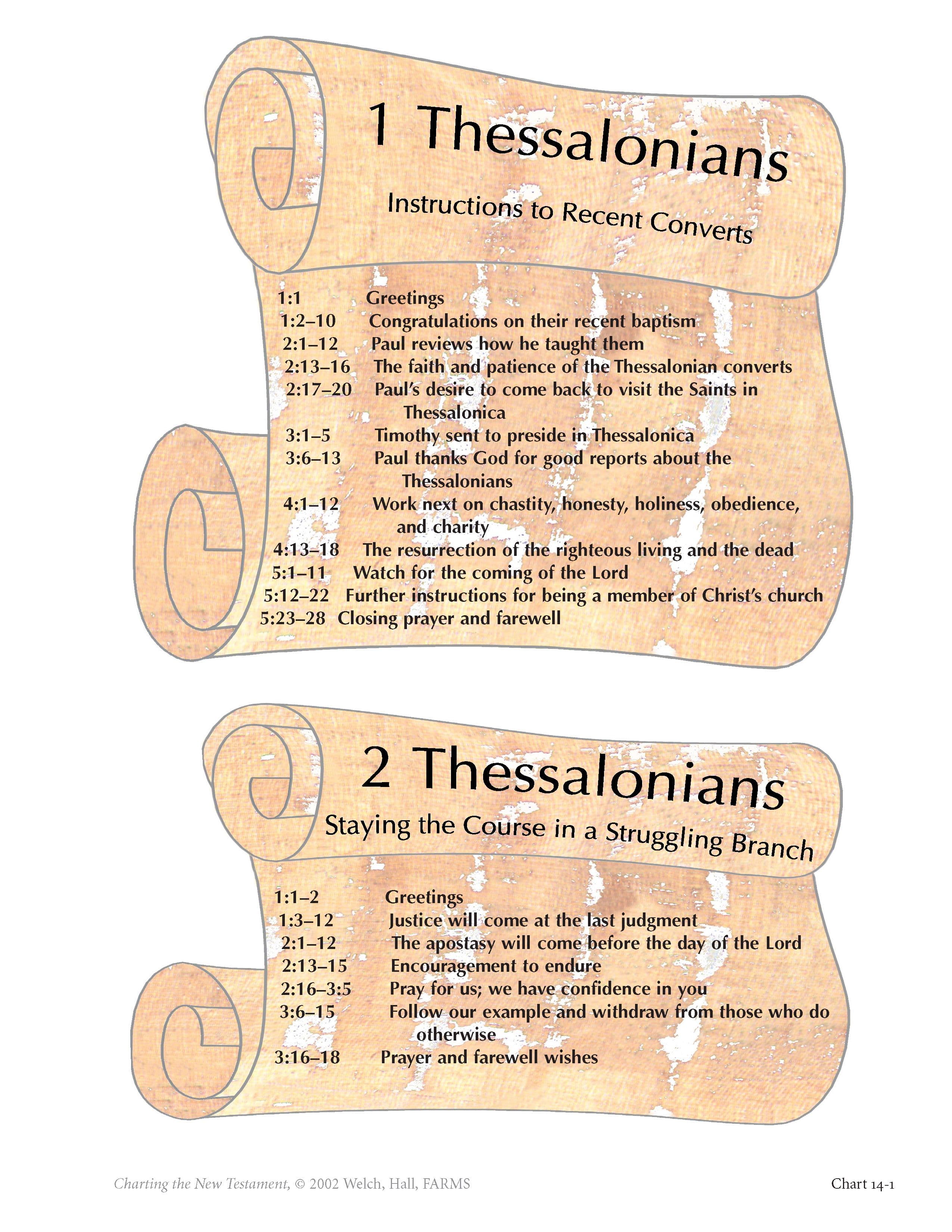 The two short letters on chart 14-1 were written close in time to each other. In 1 Thessalonians, Paul instructed his new converts, trying to move them forward beyond baptism toward other lofty goals; but his optimism fades in 2 Thessalonians, where he must admonish them to stay the course as this fledgling branch of the church struggles with failed expectations.