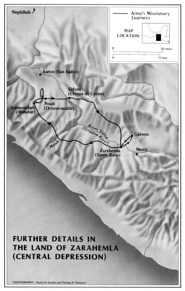This map charts out a possible understanding of the travels of Alma the Younger reported in Alma 5–16. He began in Zarahemla by calling the people to repentance in a powerful speech (see Alma 5). The capital city of Zarahemla was located on the river Sidon in the center of the land of Zarahemla. Alma traveled eastward to the city of Gideon (see Alma 6:7), where he preached about the atonement of the coming Christ (see Alma 7). He next had success in the land of Melek, "on the west of the river Sidon, on the west by the borders of the wilderness" (see Alma 8:3), and then traveled three days north to the city of Ammonihah (see Alma 8:6). Rejected, he left Ammonihah but was told to return to that city. There he converted Amulek and his household, preached a major sermon on the holy order of God (see Alma 12–13), yet continued to meet with considerable resistance and imprisonment by the wicked. He and Amulek were eventually delivered from prison, and Ammonihah was destroyed. The city of Noah, not far from Ammonihah (see Alma 49:14–15), may have been on the way to Sidom, where Alma baptized Zeezrom and many others (see Alma 15:1), before returning to Zarahemla. This map superimposes the travels of Alma on an area in southern Mexico. John Sorenson has proposed geographical locations from Nephite times that may correlate with Alma's journeys. The main purpose of this map, however, is to give only a general idea of the directions and stops in some of Alma's journeys.
