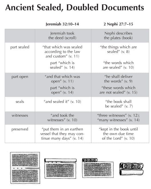 In formal Israelite legal documents, there were two parts, as documented by Jeremiah: one part that was sealed, and one part that was open (see Jeremiah 32:10–14). Seals were placed on the closed portion, and witnesses signed the end of the document, attesting to its authenticity. Finally, the sealed doubled documents were placed in containers and preserved. The pictures at the bottom of this chart show the process by which ancient manuscripts containing one closed part and one open part were folded and sealed. The Book of Mormon, as 2 Nephi 27:7–15 indicates, followed this ancient process of sealing and authenticating a text. The plates of Nephi had two parts: one open and one closed. Seals kept the closed part secure, and as promised anciently, witnesses were provided who signed the Book of Mormon after it was translated. Interestingly enough, the testimonies of the Three and Eight Witnesses were originally placed at the back of the Book of Mormon, at the end of the document, just as ancient Hebrew law would have required. The plates were preserved in a stone container until the Lord directed Joseph Smith to translate them.