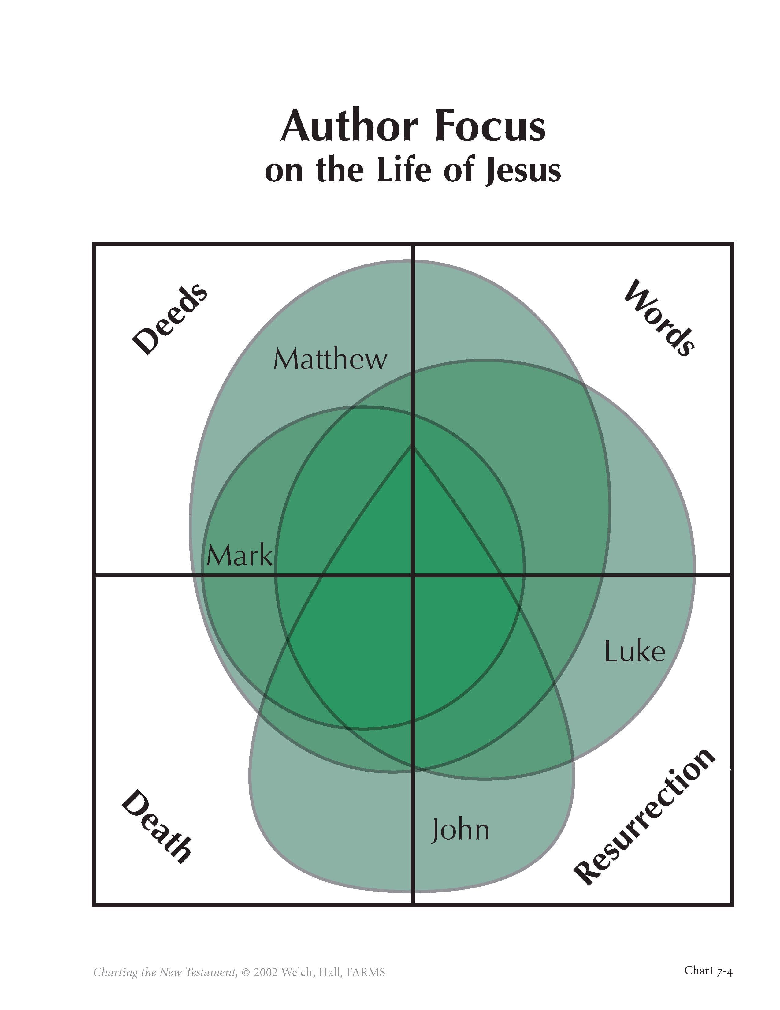 It is interesting to note that each Gospel tends to place a different degree of emphasis on the words, deeds, death, or resurrection of Jesus. As chart 7-4 shows, Mark, for example, is primarily interested in what Jesus did; his is a gospel of divine power. Matthew and Luke, however, are more interested in telling what Jesus said. John’s interest in testifying about the eternal nature of Jesus and his mission is reflected in the fact that his Gospel devotes a very large portion of its attention to the eternally important events of the last supper, the words of Jesus to Pilate, and the resurrection of Jesus.