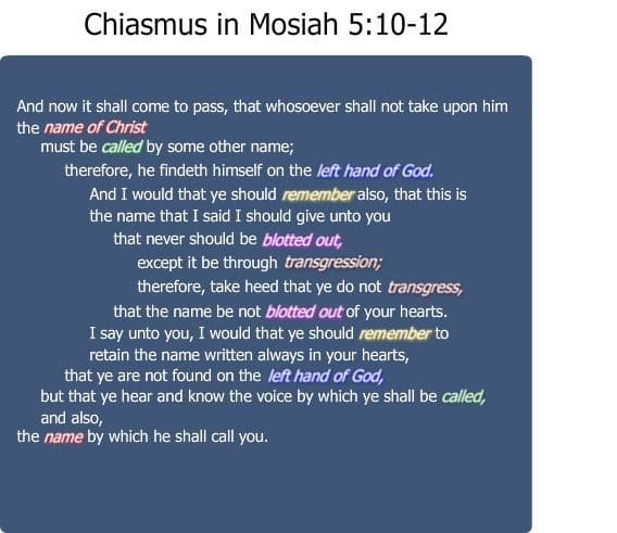 King Benjamin uses chiasmus several times in his great speech in Mosiah 2–5. In Mosiah 5:10–12 he emphasizes the central importance of taking upon oneself the name of Christ. In this concluding section of his speech, the people enter into a covenant with God and are called the children of Christ. They receive the name of Christ, which will never be blotted out, except by transgression. Transgression therefore receives the focus as the center of this chiasm, which stands at the center of this final section of the entire speech. Benjamin's skillful use of this literary form shows that he carefully and deliberately prepared his masterful oration.